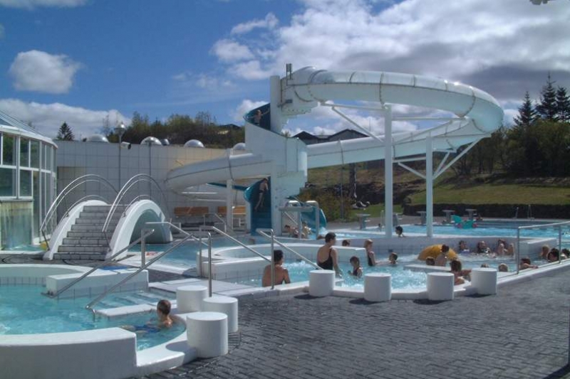 Today we went swimming at a pool called Árbæjarlaug. I went on this awesome slide like 20 to 30 times. The pool was better than the pools in Canada because it had a water slide, two giant fountains, about four hot tubs, and an indoor/outdoor pool. There was also a good view of mountains. The water was warmer than at home.