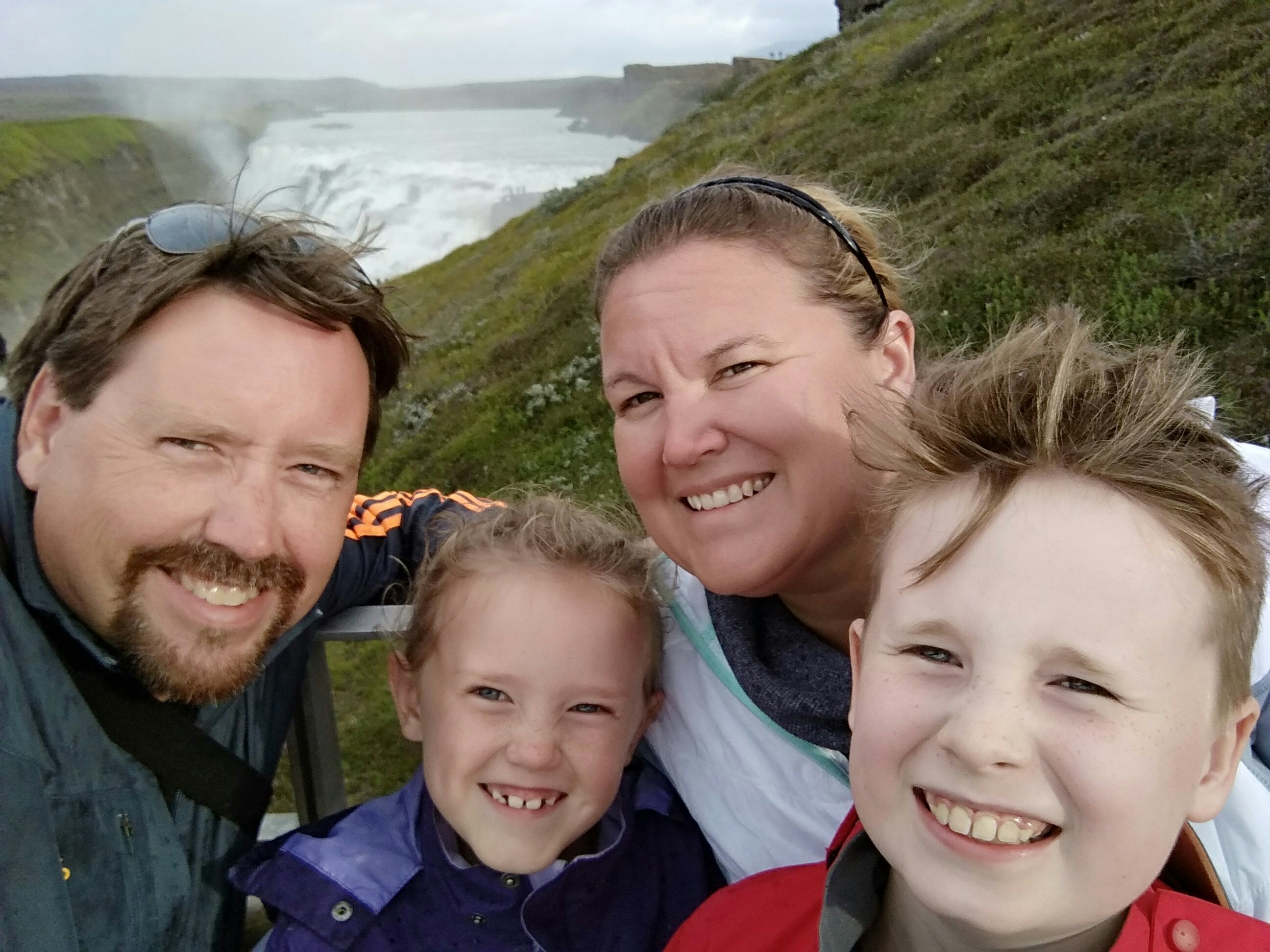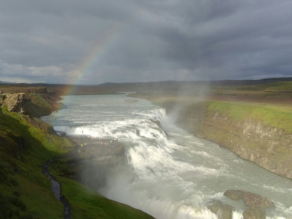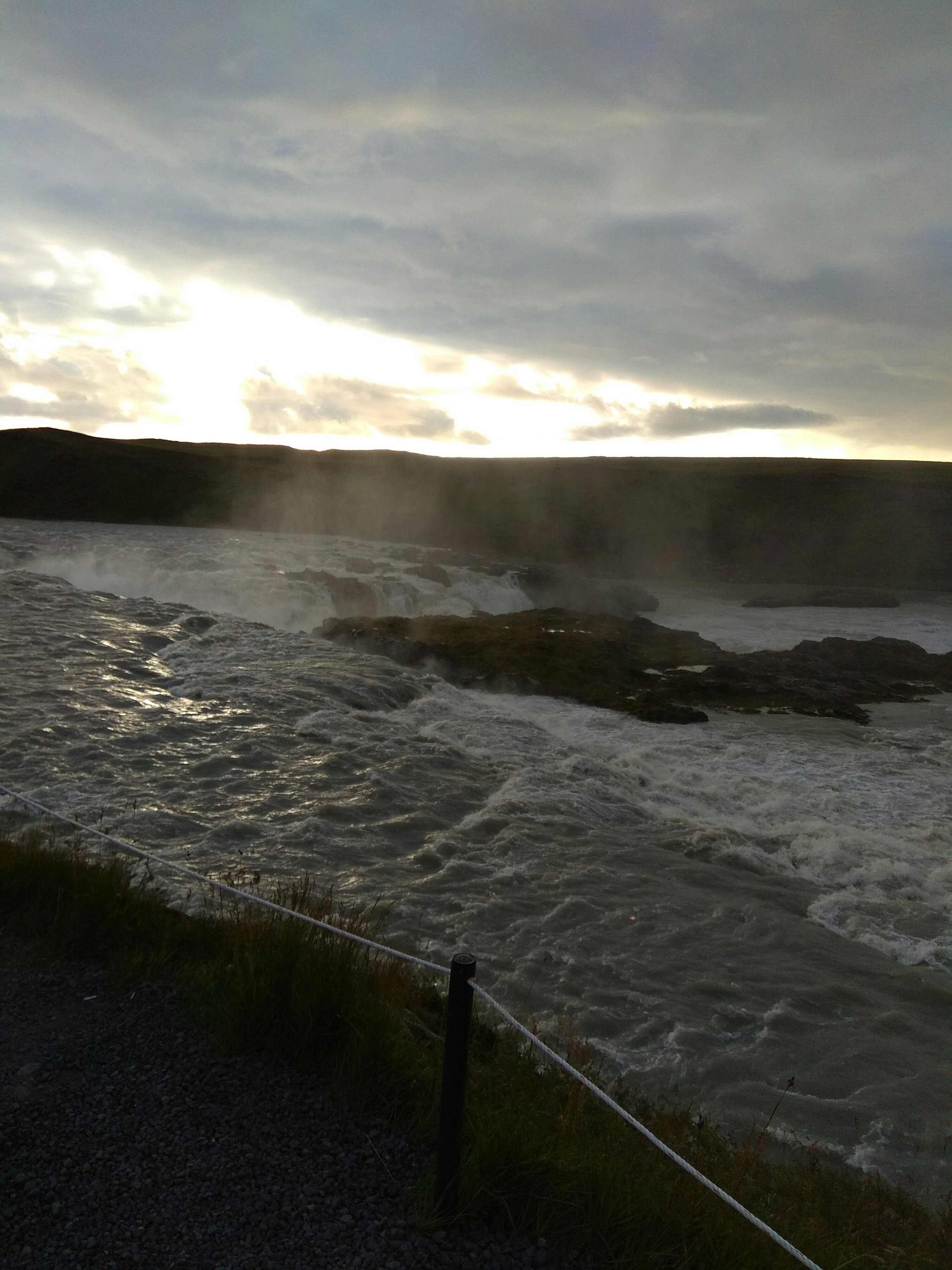 A mere ninety minutes later, we pulled into the parking lot for Gullfoss, a huge and beautiful waterfall that produces a rainbow every time the sun is out. Even though most of our day had been cloudy, the sun popped out to make a brief appearance just for our visit at one of Iceland’s most popular spots! Yay, us!