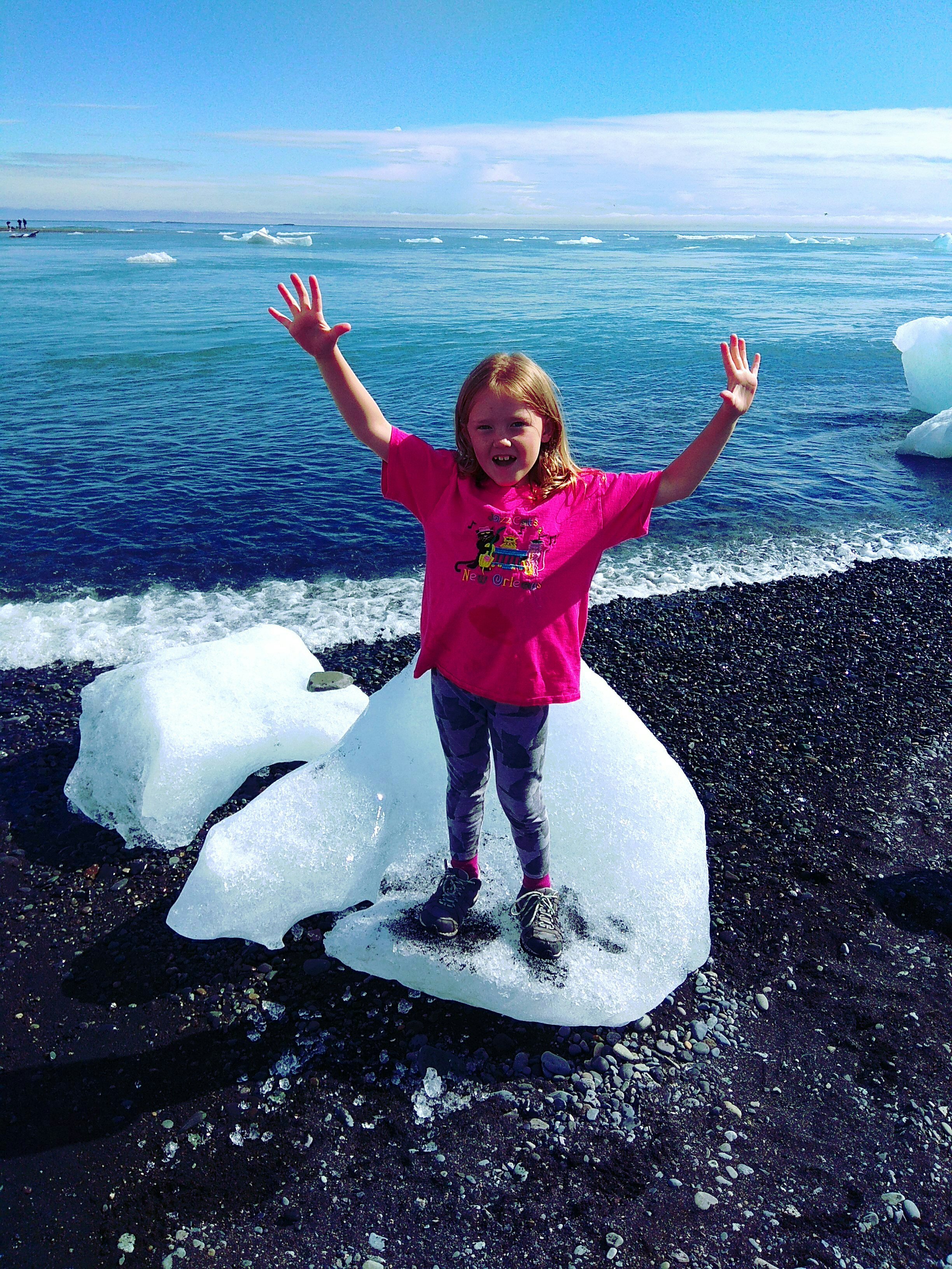 Today my parents woke me up at 5:00. It was really early! It took more than four hours to get to icebergs. It was worth it. We had a picnic there. The icebergs were neat shapes – I saw an airplane, a puffin, a person, and more. I saw some seals in the water, too. On the beach, I made a bear foot out of rocks.