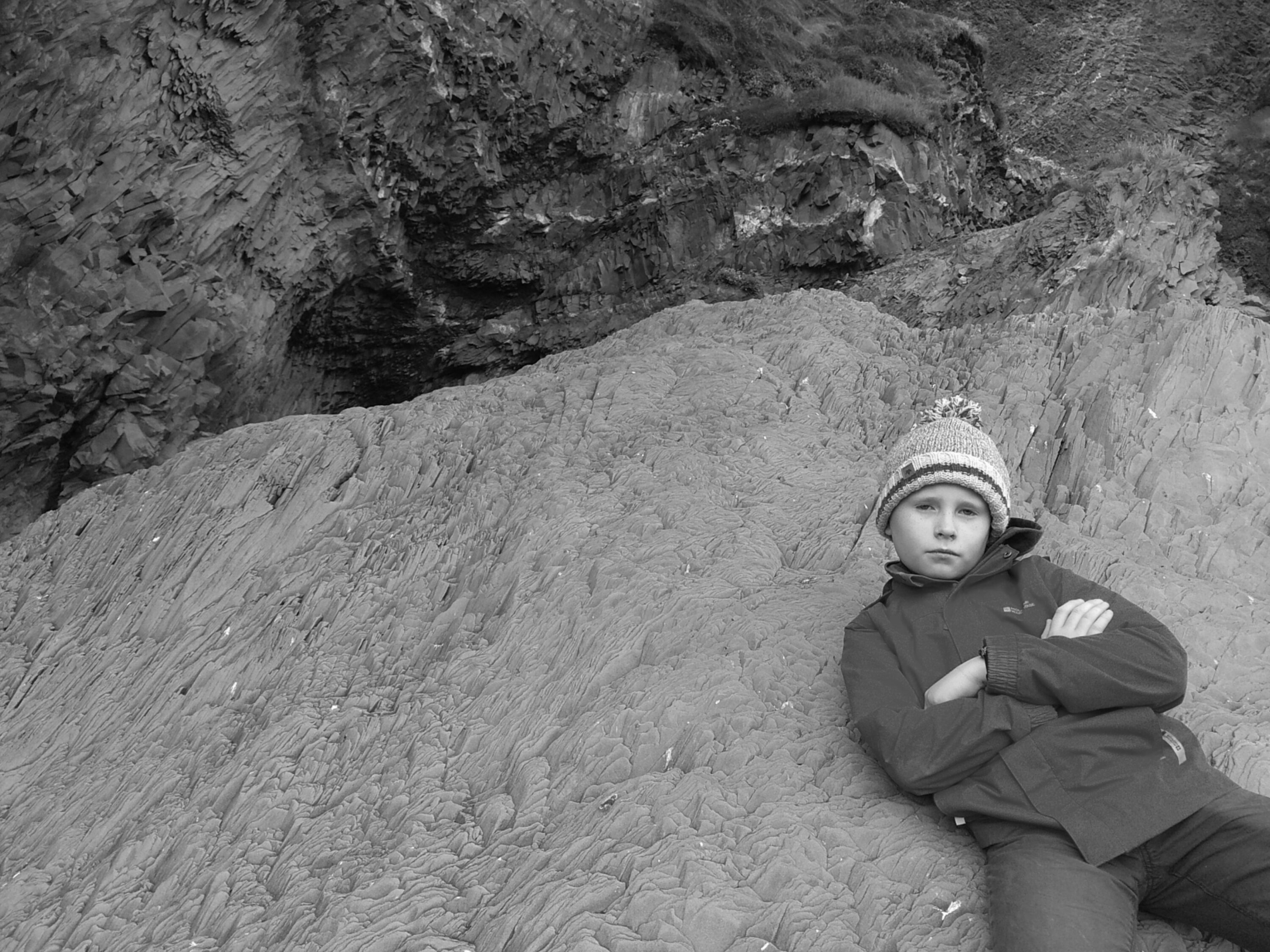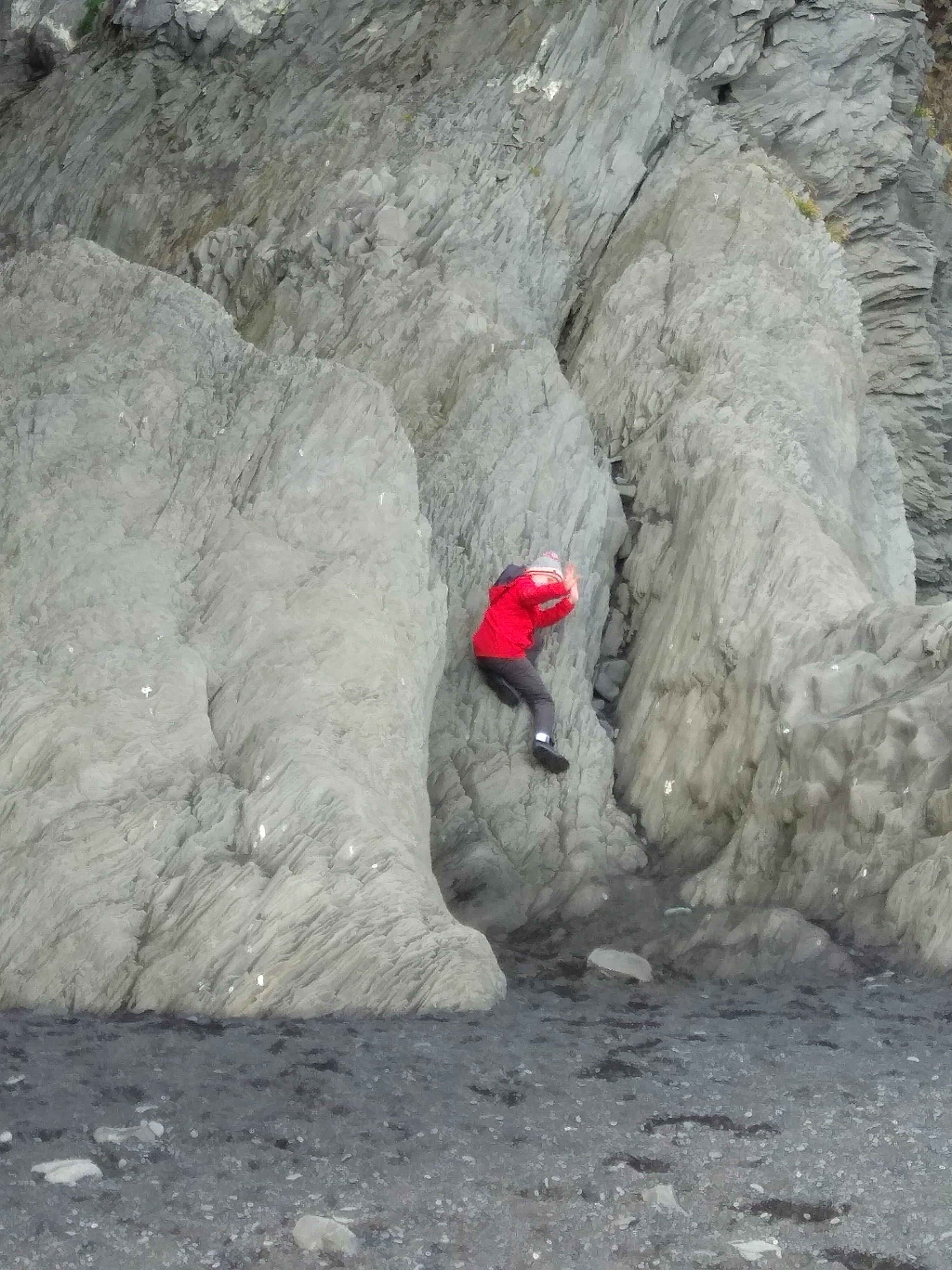 Next we went to some big cliffs that I could climb up easily. It was so cool! The rocks were really big and flat and they were all round. There were a lot of big waves. It was a black sand beach.