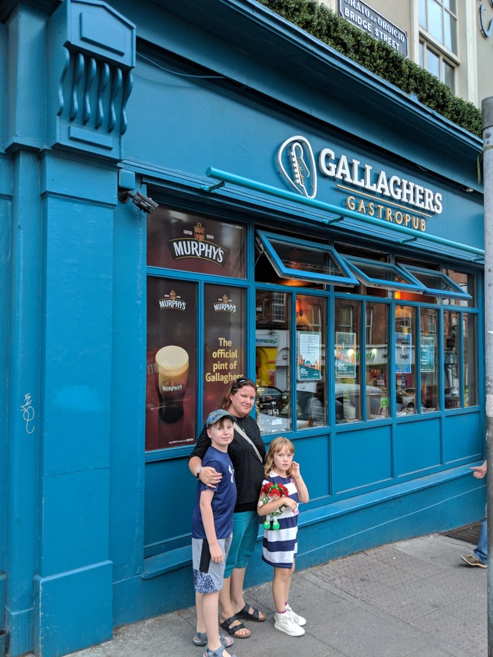 We headed back to Cork for dinner at a lively pub called Gallagher’s. It was quite noisy, which surprisingly bothered the kids. I guess they prefer to be the loudest ones in a room… π Brad and I had fantastic food – his burger was huge and I finally found a steak pie to die for! And dessert… Mmmm…
