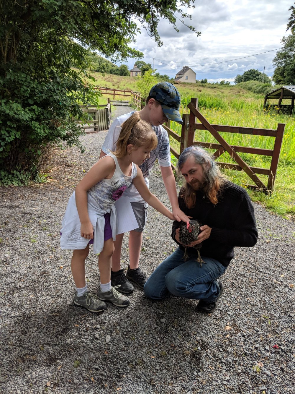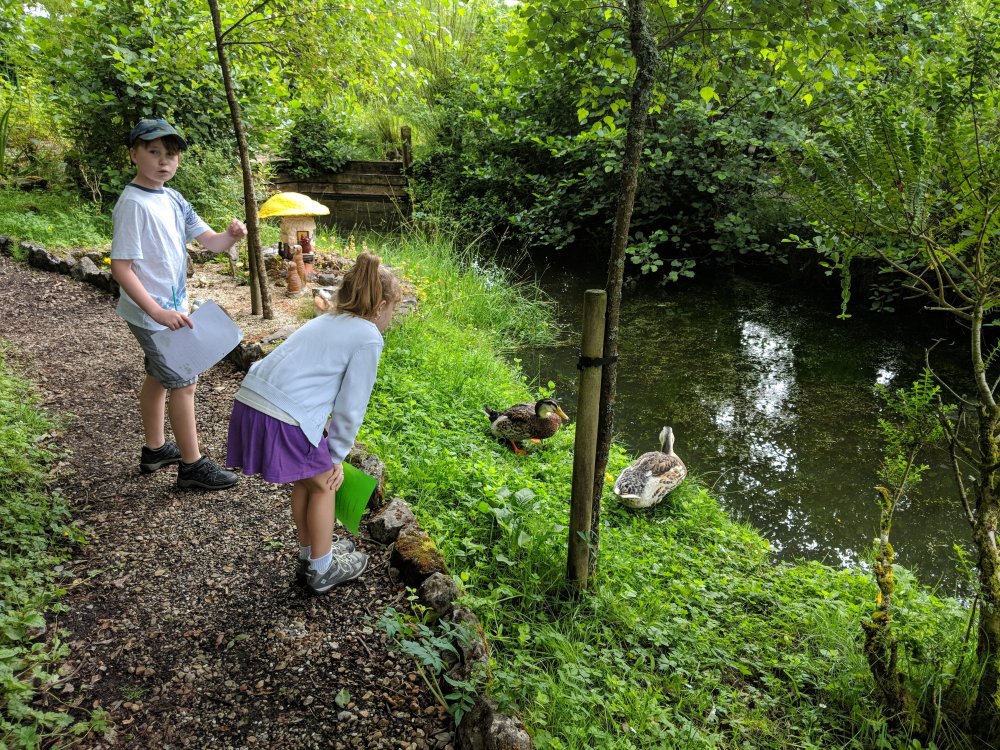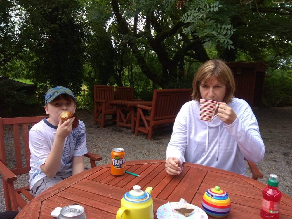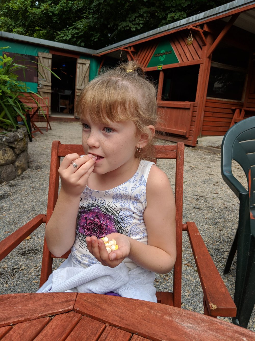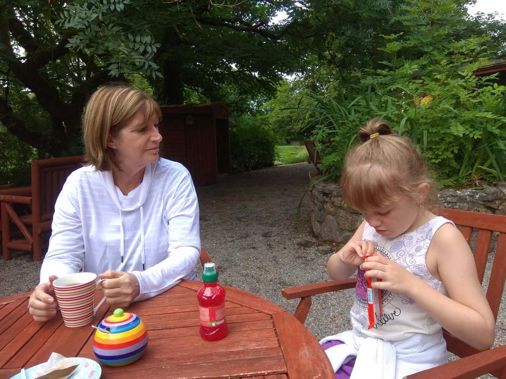 The owner met us there, caught a chicken for Charlotte to pet, and then sat down with us to go over the kids’ answers while we dined on tea and scones (Grandma and I), juice and sweets (kids), and a sausage roll (Brad). He praised the kids for their correct answers and told them what mistakes they made. Then he brought them candy mushrooms for working so hard.