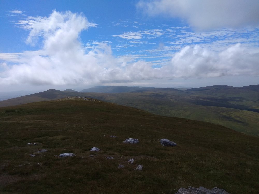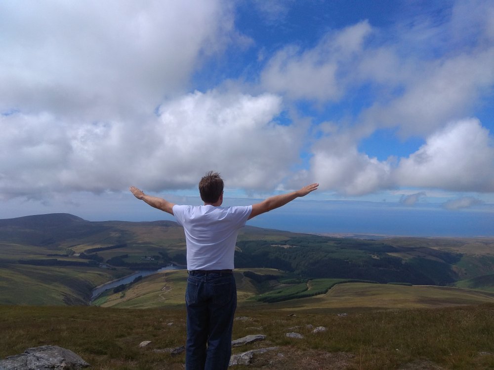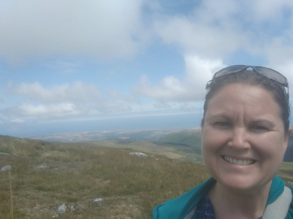 We got back on the train and took it up Snaefell mountain. It was a nice view and very beautiful. I had to watch out for sheep poop when I was walking around. We took a photo of me holding a cloud.