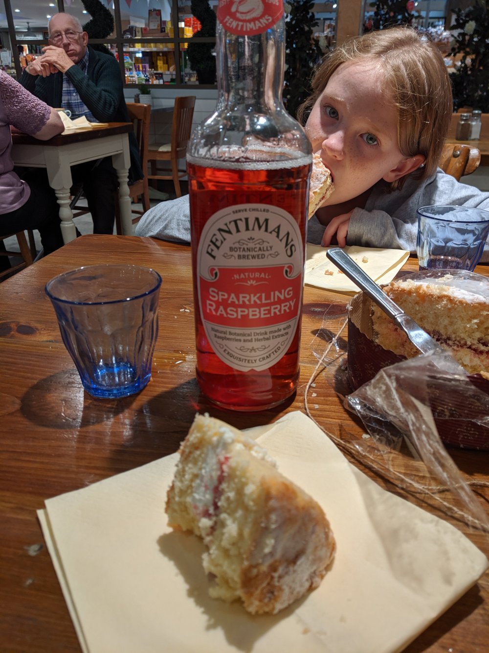 We had a snack of fizzy raspberry juice (I didn’t like it, but my mom thought it was delicious) and Victoria Sandwich cake. It was good but very sweet.