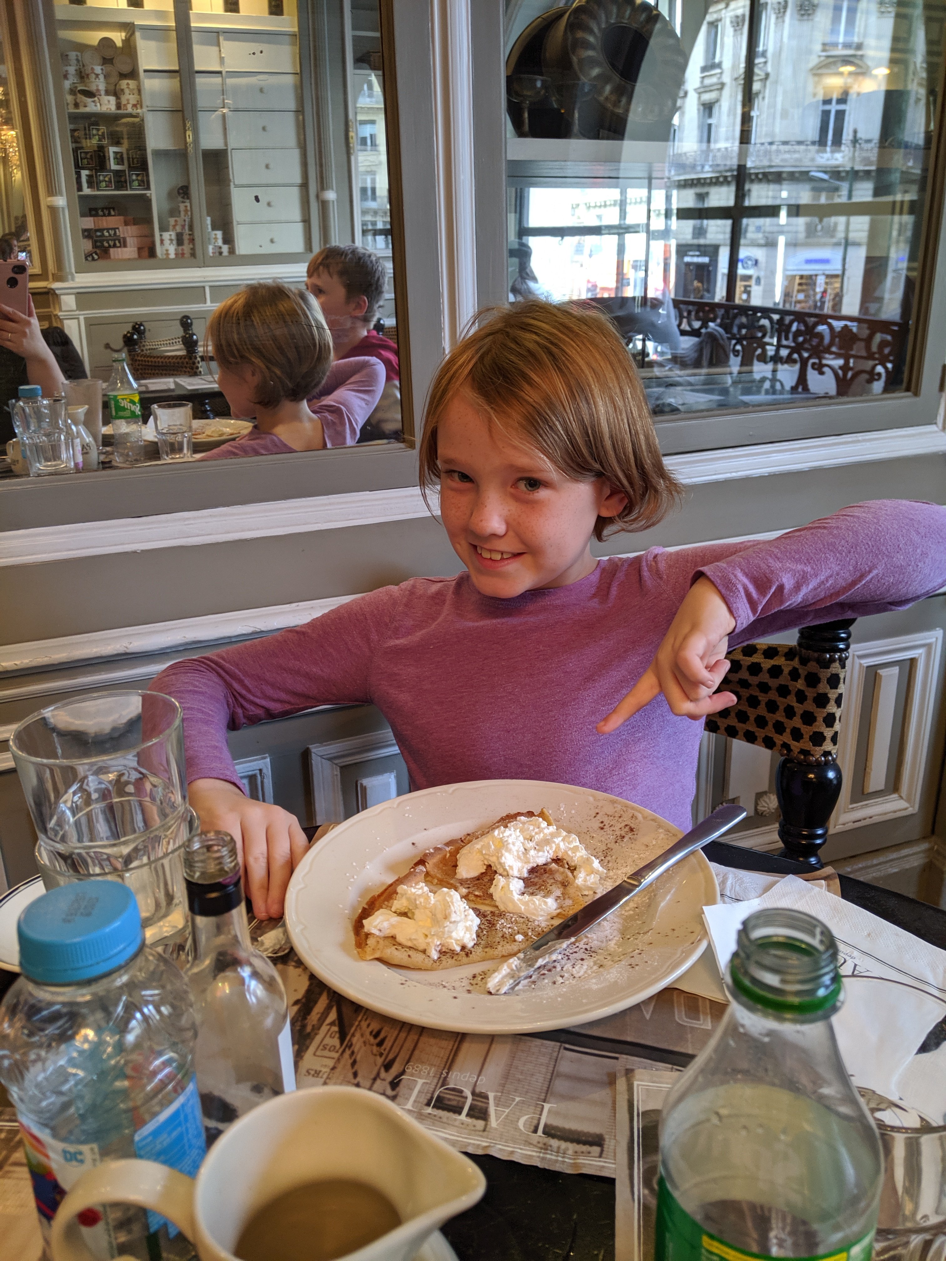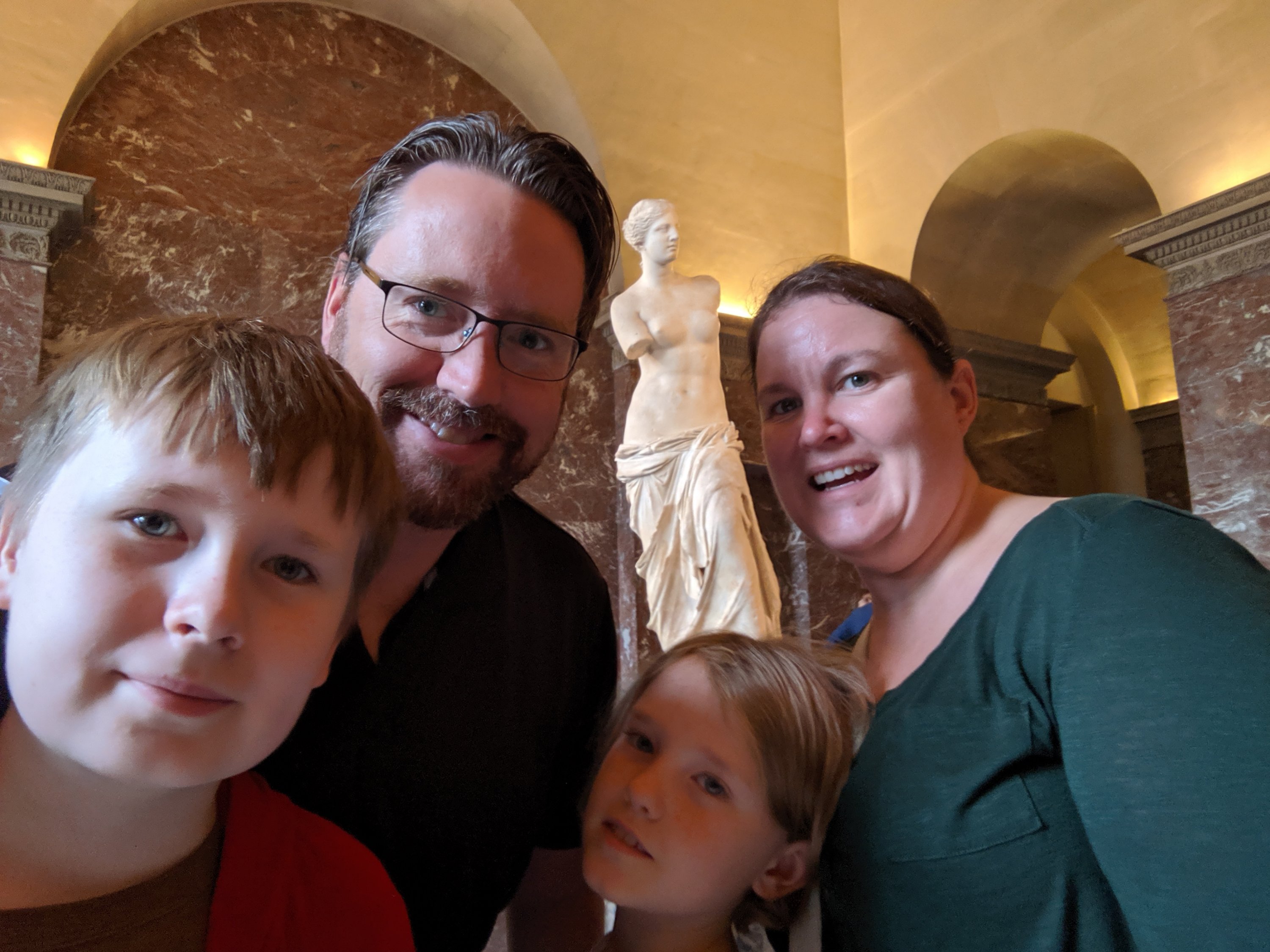 1. I loved the art you photographed in the Louvre. I cannot wait to explore this myself some day! And the Eiffel Tower! Loved the pictures of you kids and the one of your parents in front of it! What an absolutely wonderful day! Your meals looked delicious… was that a crepe you had for dessert, Char? And what was on your plate, Jenn? Looks like a cross between a piece of quiche and a piece of pecan pie! Sam, did you eat your salad??