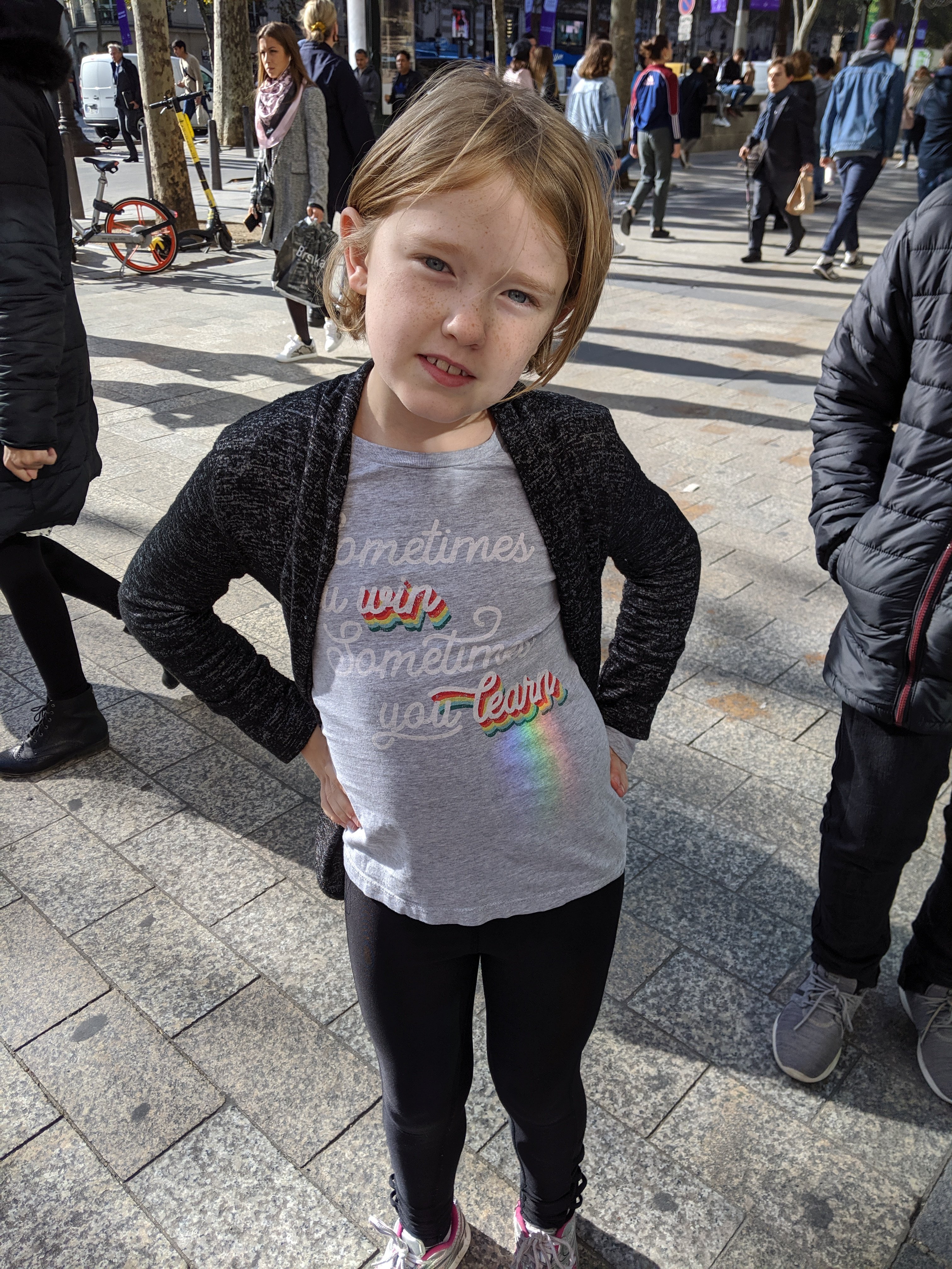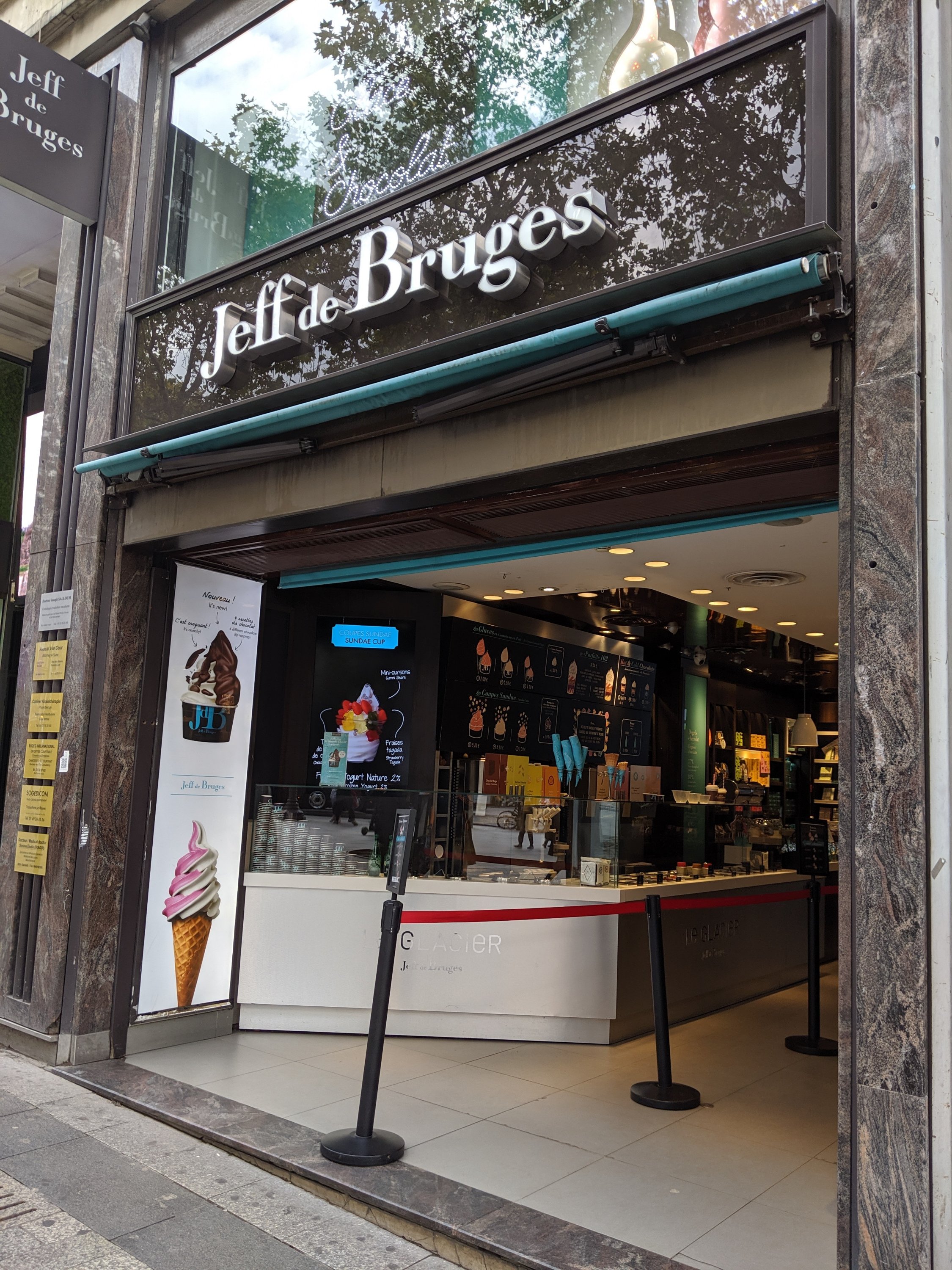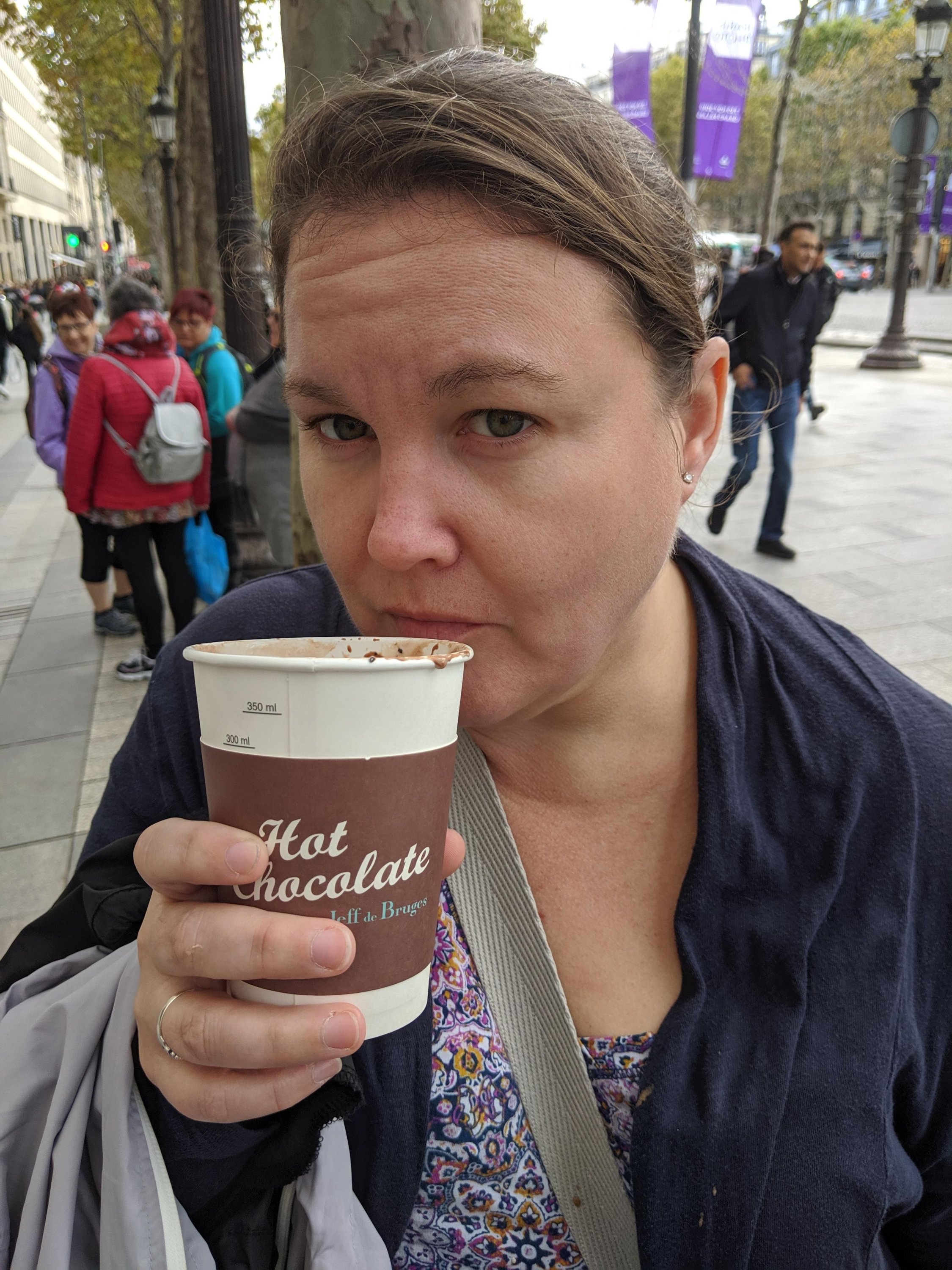 As we were walking, we saw a chocolatier named Jeff de Bruges. We went in it to check it out, and we got a hot chocolate. They gave us four straws, and we went outside to drink. Mom said, “It’s very hot, so be careful,” but Sam didn’t hear her so he took a big gulp and spit it on my hand. I yelled, “OWWW!”