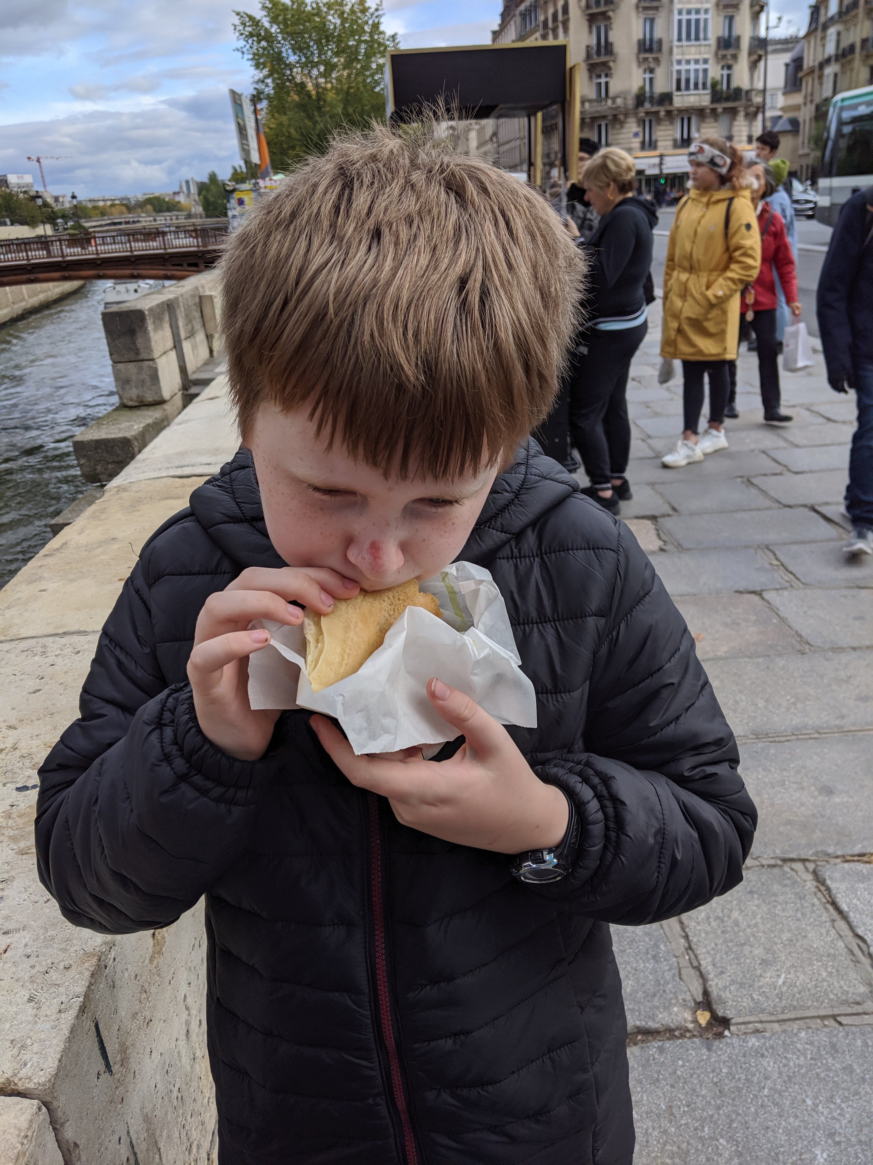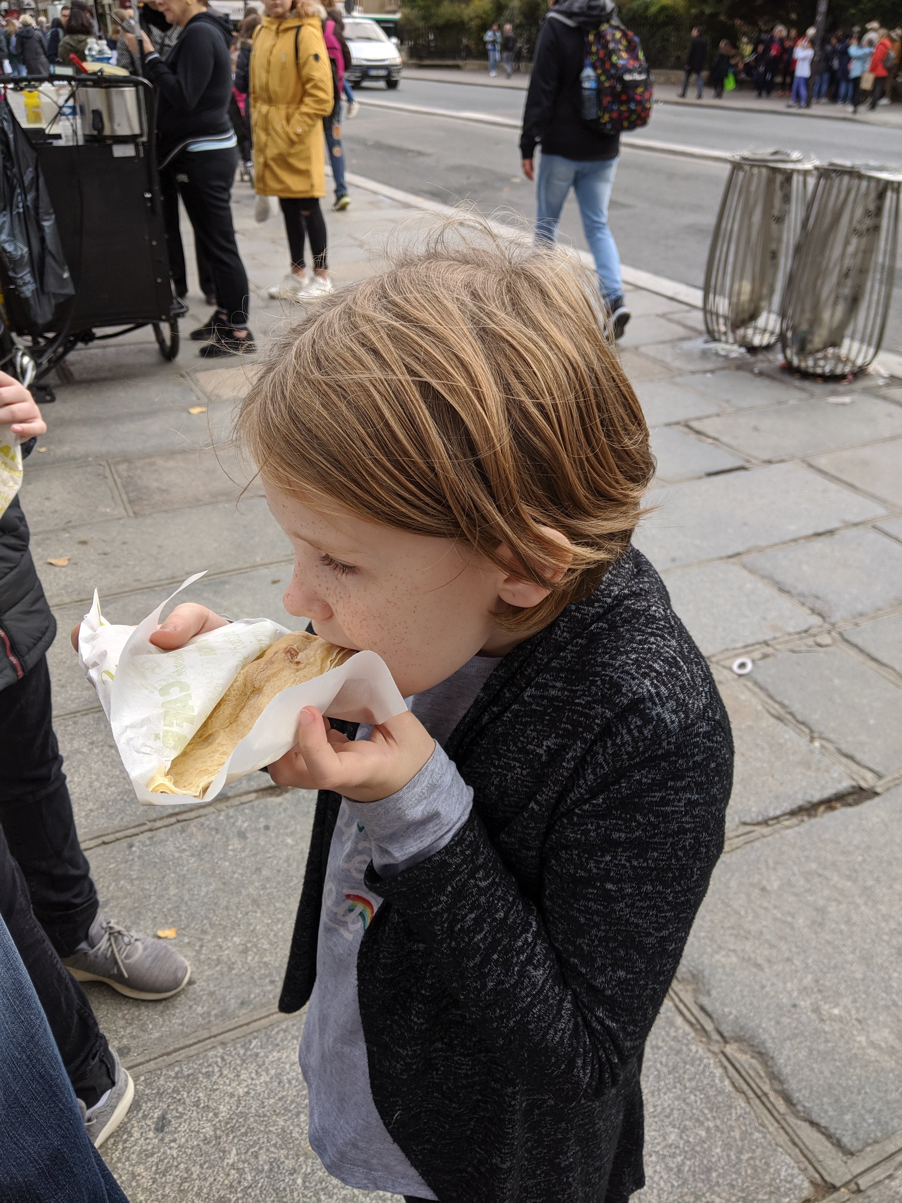 We walked past an accordion player and got some crepes from a stand. I got salted caramel and Charlotte got strawberry jam. All along the river there were market stalls that sold a lot of different things like handmade paintings, books, and souvenirs of the cathedral.
