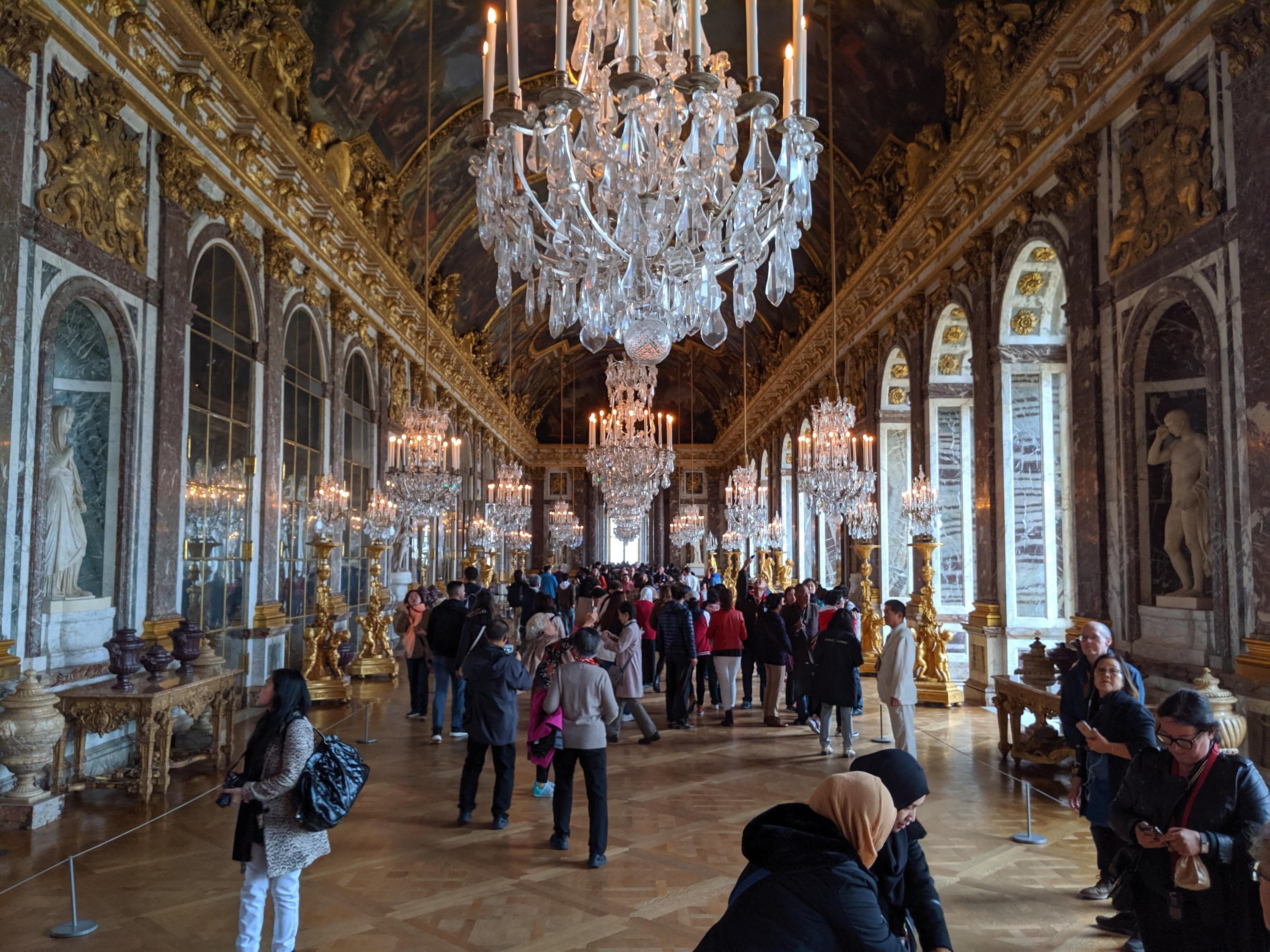The Hall of Mirrors wasn’t really what I expected. I thought it would be a short hall with a bunch of mirrors in it. Instead, it was one of the biggest rooms in the palace with many crystal chandeliers and entire walls of mirrors. It was shiny, fancy, and crazy.