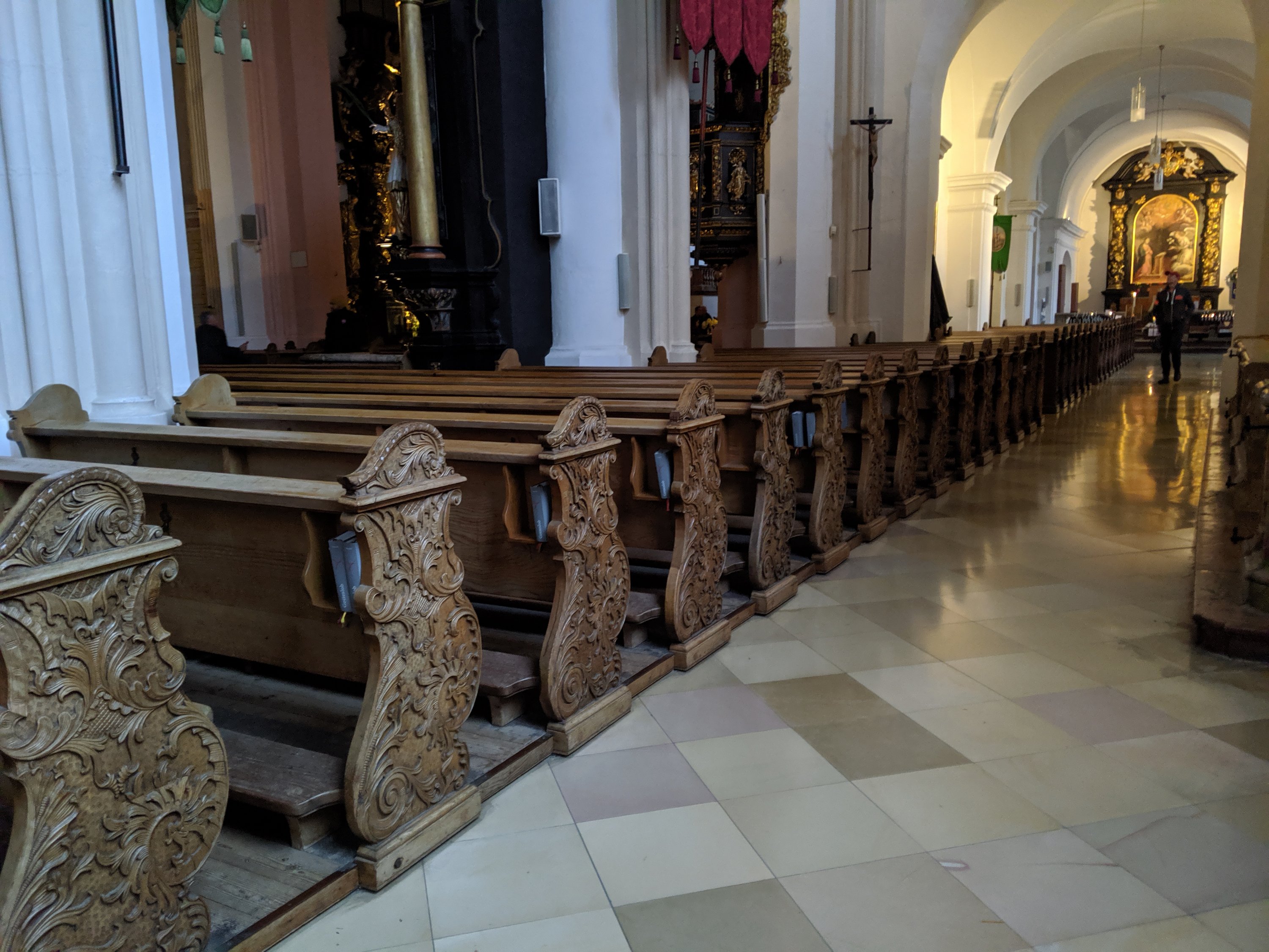 While we were stopping at the church from the wedding scene, we had a little dessert. I had hot chocolate and a little piece of cake. Mom also had hot chocolate. Sam and Dad had water. Then we had to get back on the bus to return to Salzburg.
