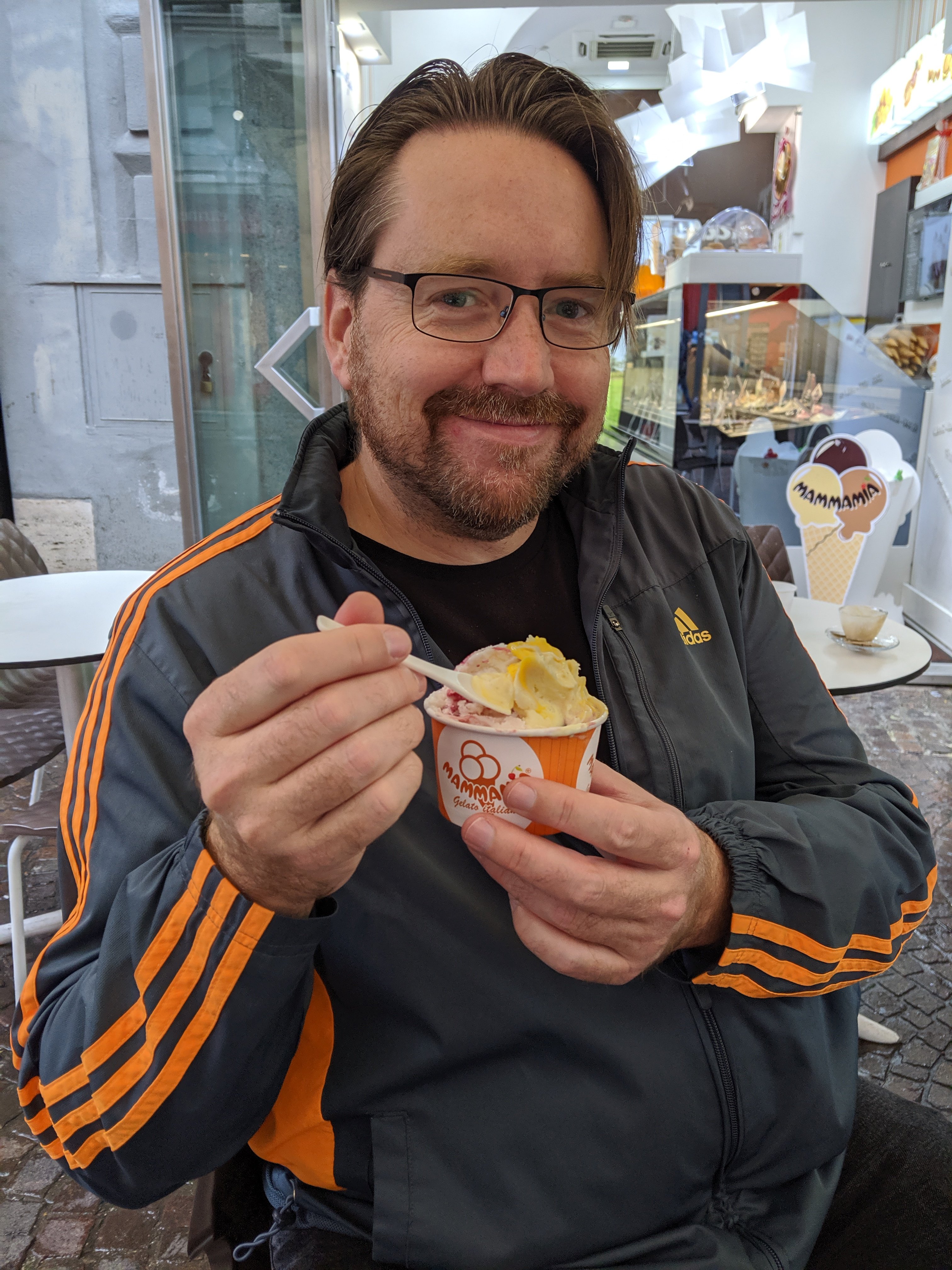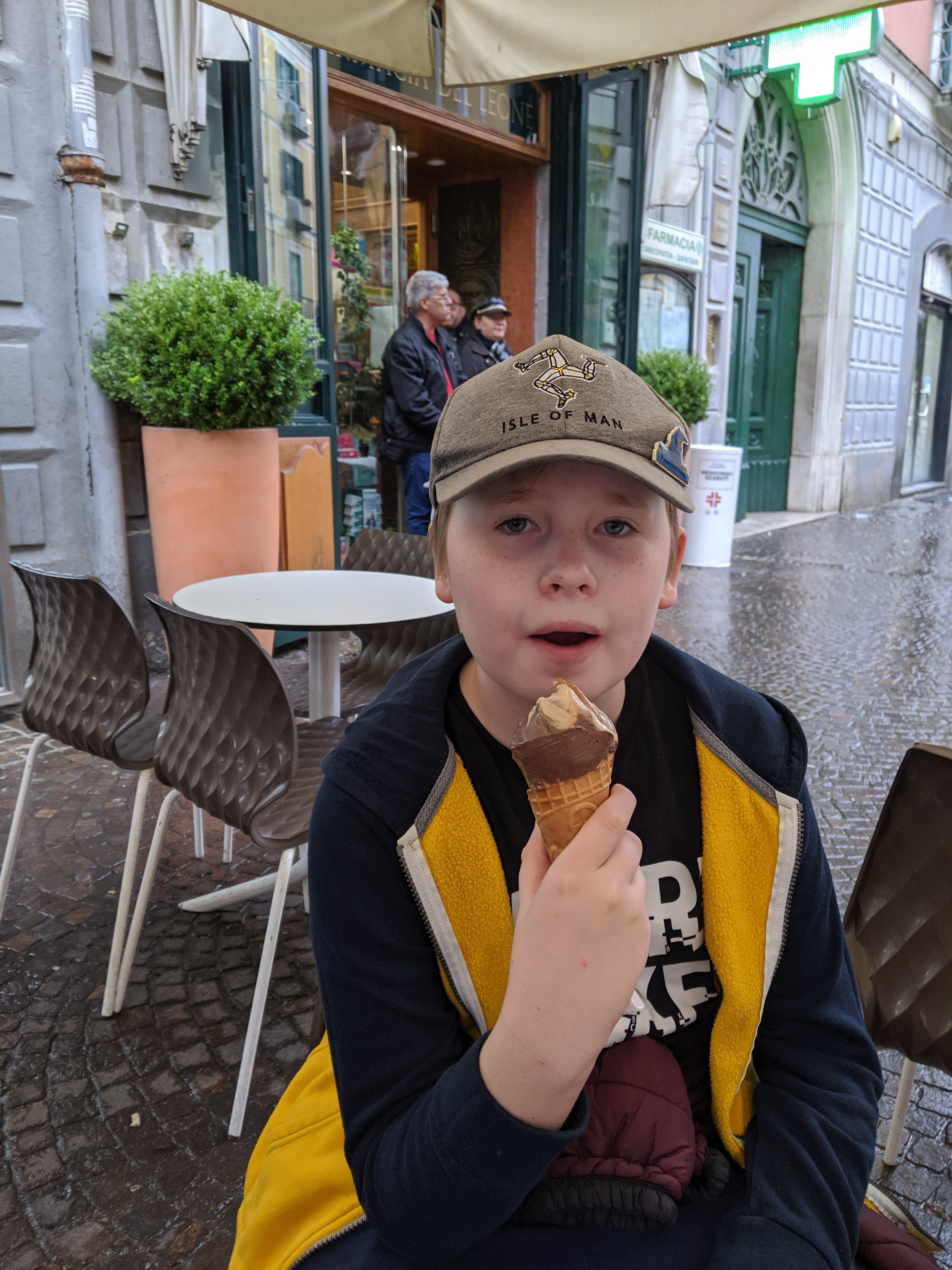 We started to walk, but by then we were hungry so we decided to have gelato for lunch (we were allowed because our town doesn’t have any gelato now – they think it’s too cold). It was raining, so we ate under umbrellas.
