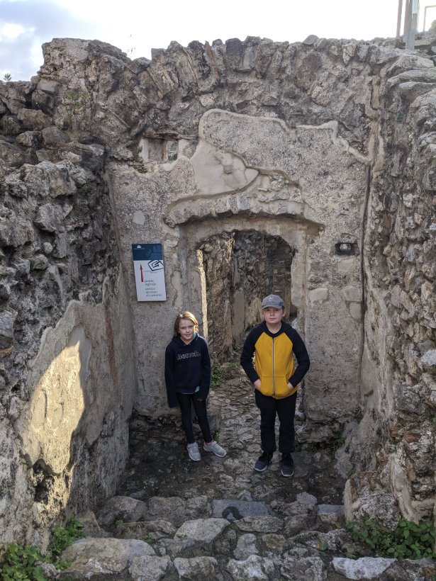 Later we went for an afternoon snack at a cafe. We each got a slice of pizza (Mom and I got the same kind). Then we caught a bus up to a really old castle that was built in the 6th century.