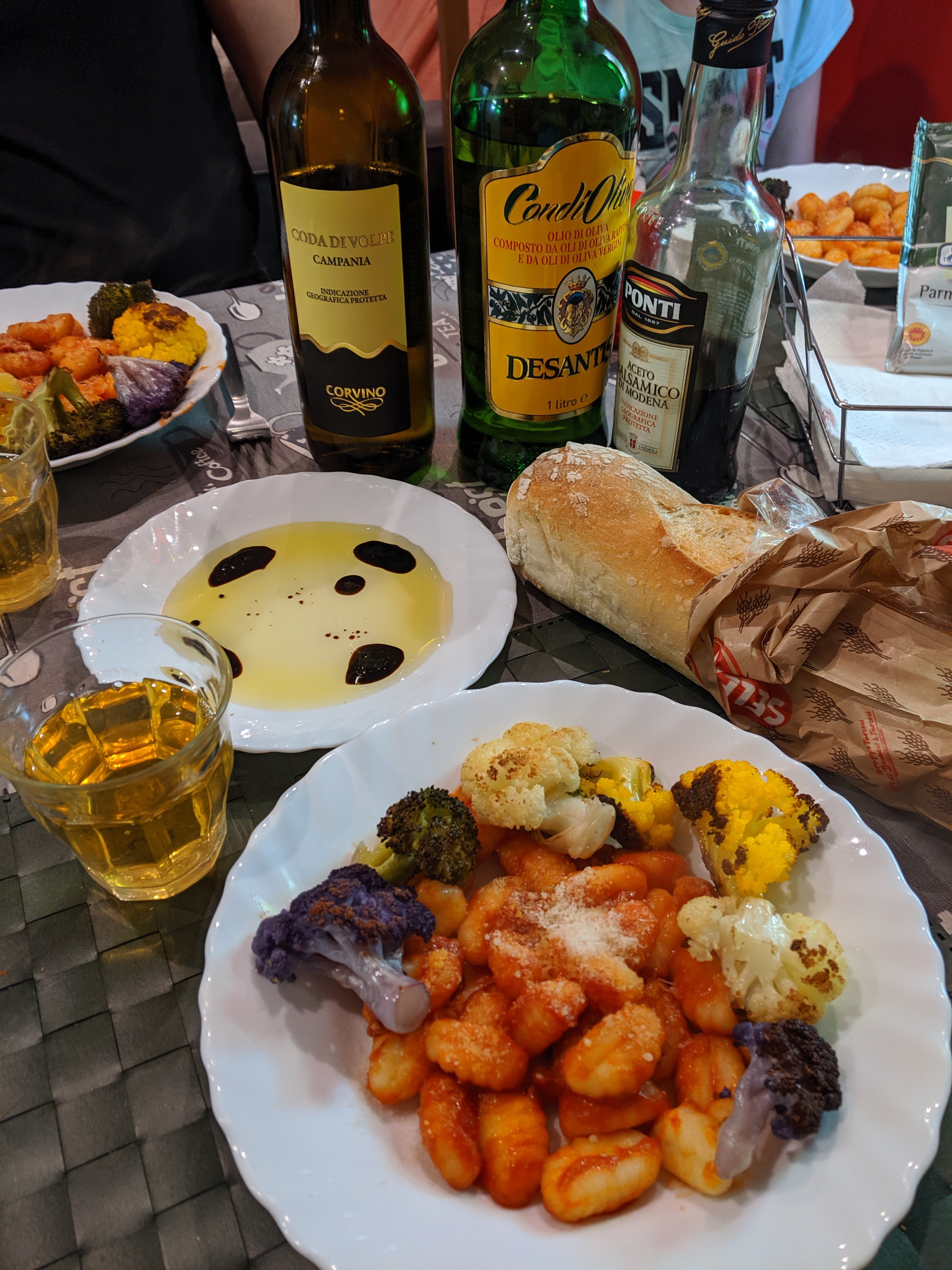Mom made dinner of gnocchi with pomodoro sauce, crispy pancetta and parmigianno reggiano cheese. It very tasty and filling. Gnocchi is little cloud-shaped noodles made of potatoes. We also ate bread with olive oil and balsamic vinegar to dip, and roasted broccoli and tri-coloured cauliflower. We had limoncello and cherry gelato for dessert. I loved both flavours.