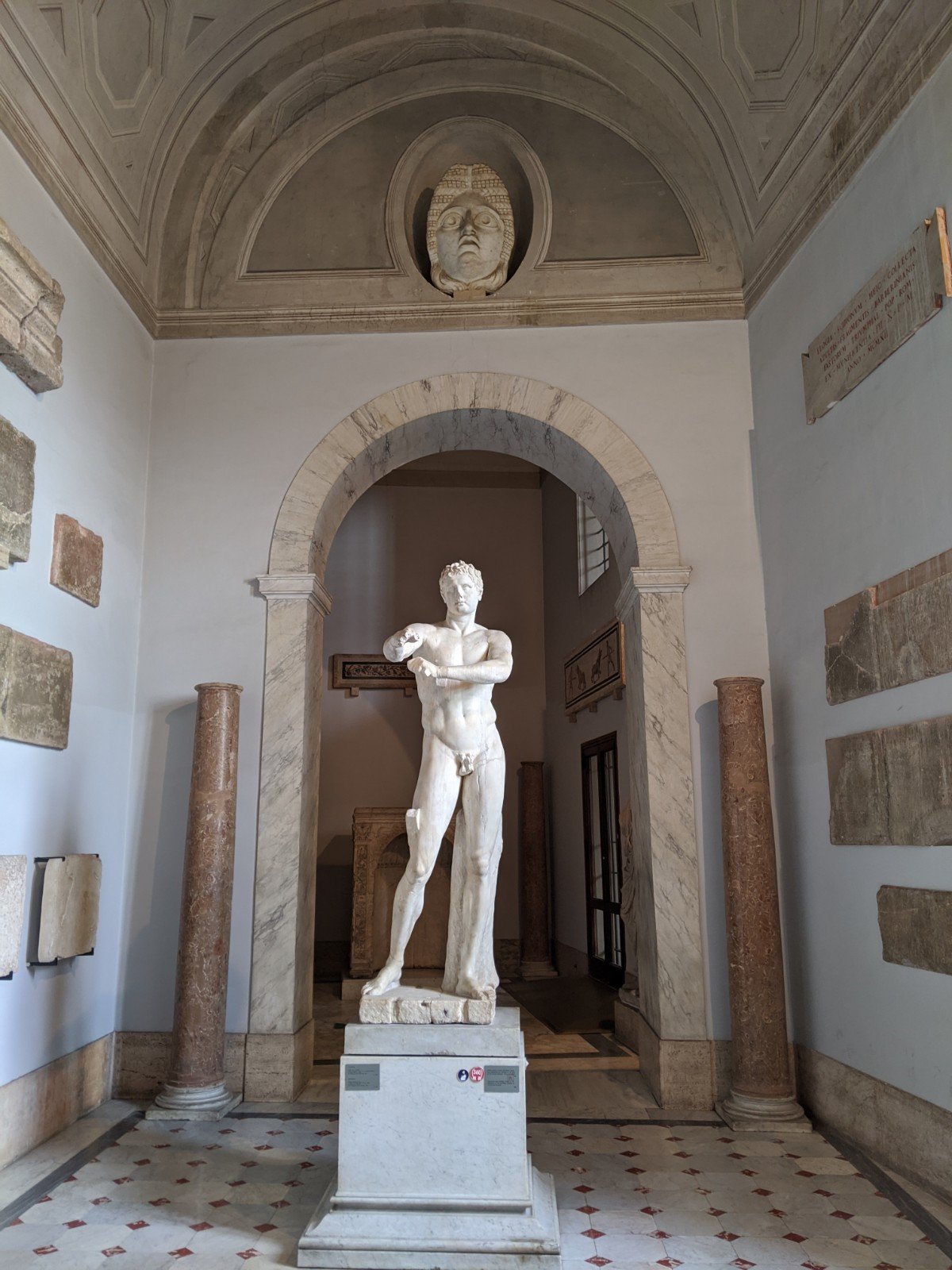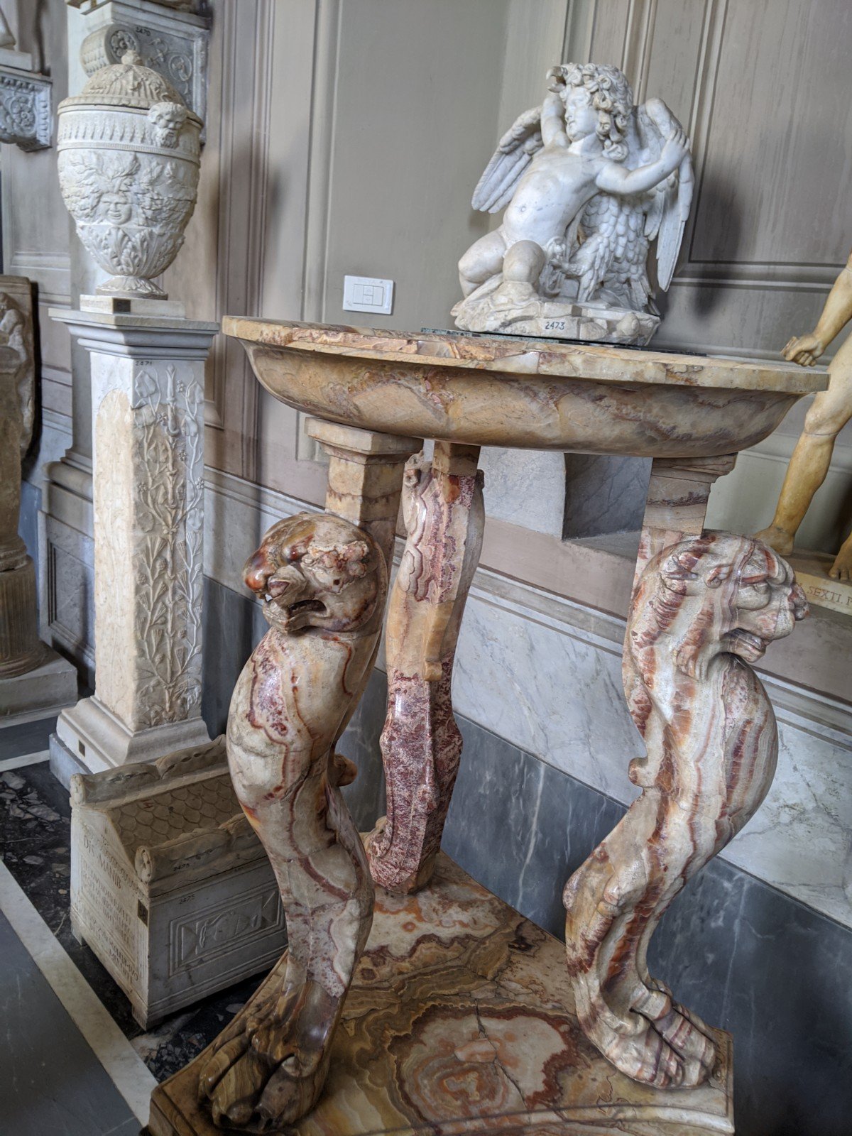 In the Vatican museum, there were rooms of ancient Egyptian mummies and carvings. Most of the carvings had hieroglyphics on them (I learned to write my name in hieroglyphics). We took some pictures that I can try to translate them. The mummies were cool because they weren’t all wrapped up so you could see what they looked like. You could see their head, hands and feet which was really creepy. They were all dried up and very dark.