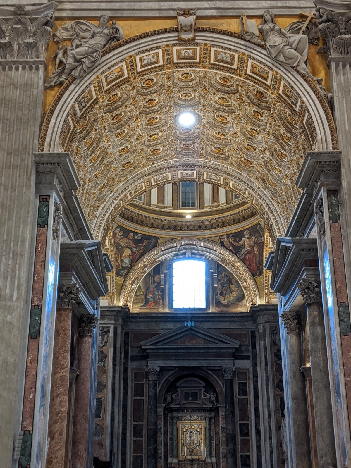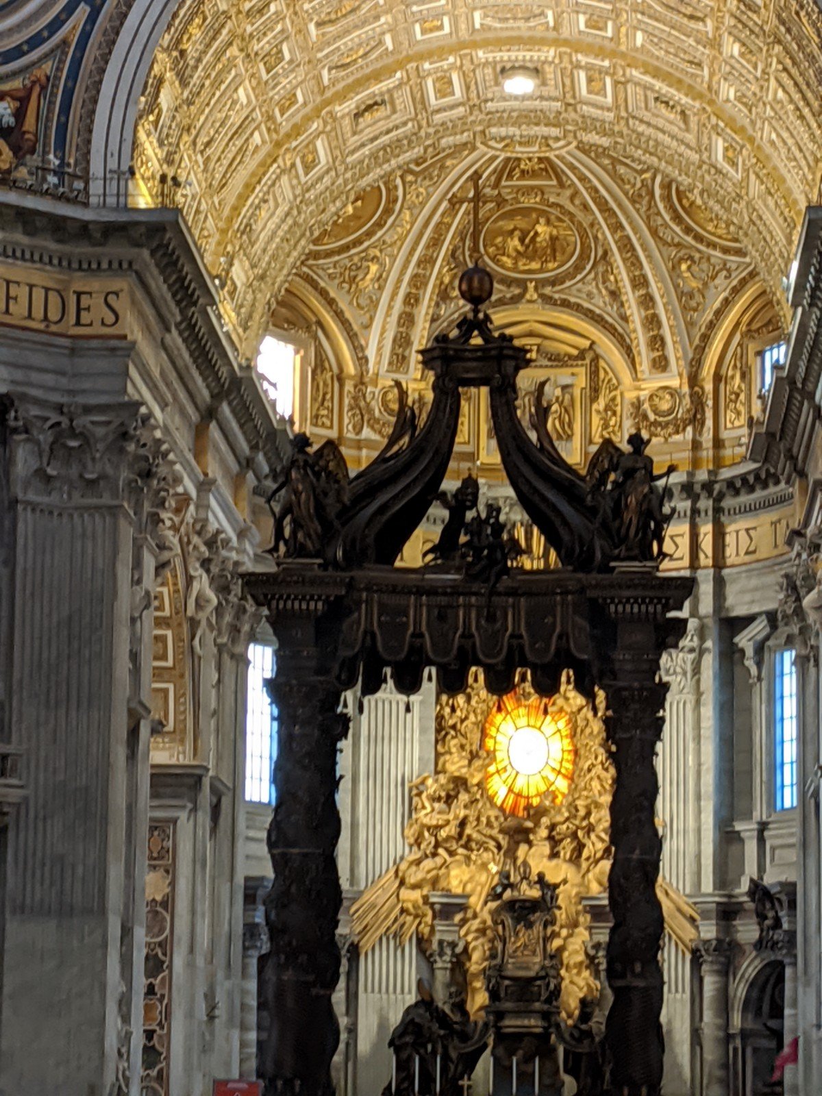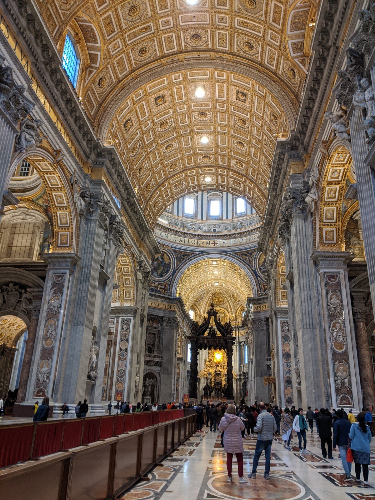 After the museum, we went to St. Peter’s Basilica. It was gigantic. The biggest church ever (it is actually the biggest cathedral in the world)! There were really big pillars, lots of marble and gold and paintings. There was a gift shop, too. There was a beautiful dome on top. It is very tall (over 100m)!