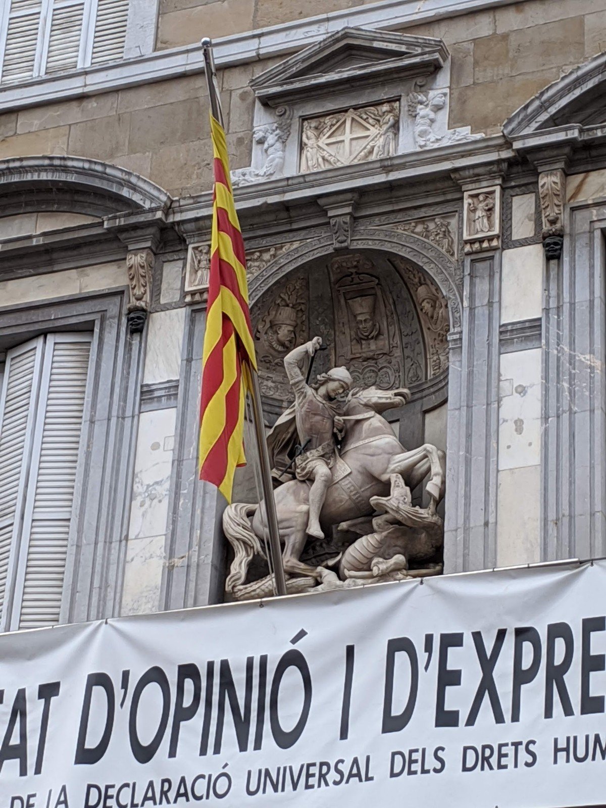 Flags on city hall (left to right: Catalan, Spain, Barcelona)