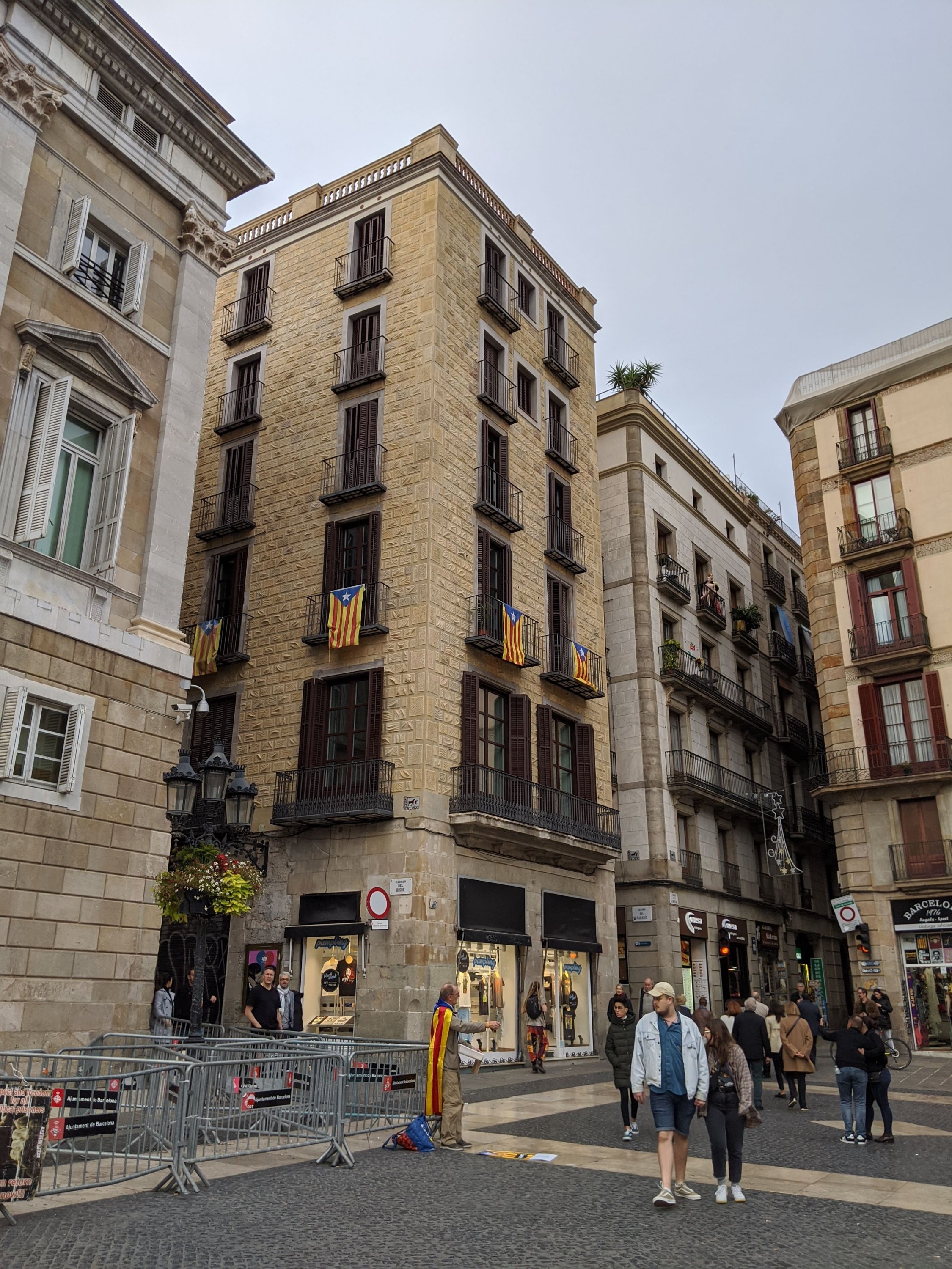 We went to another square, and we learned about Catalan and how Barcelona is the capital of the region. Some people want Catalan to separate from Spain. They have special flags on display.