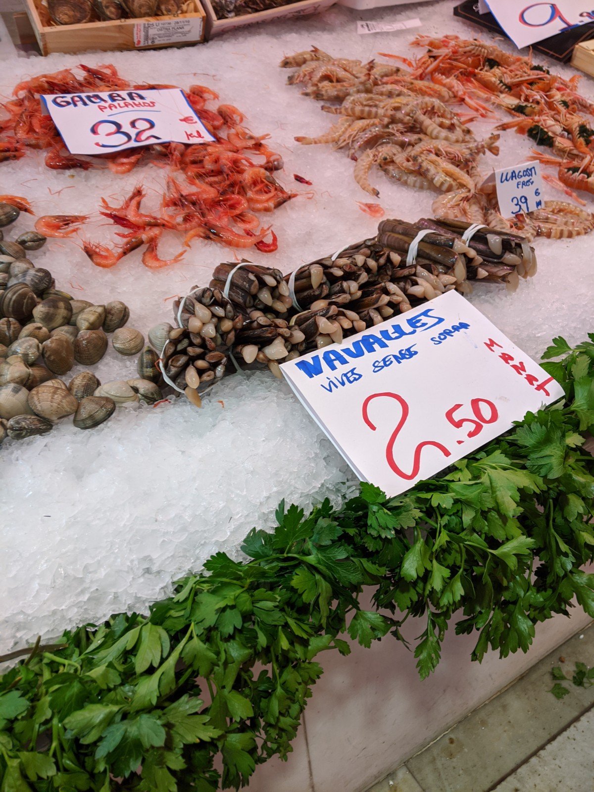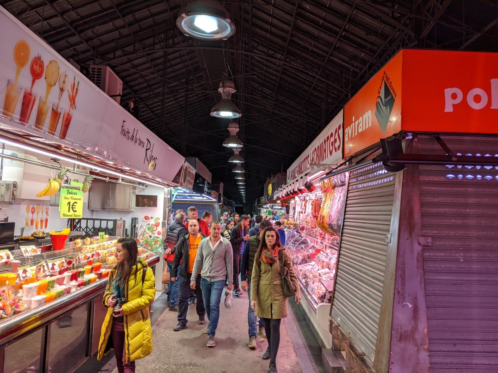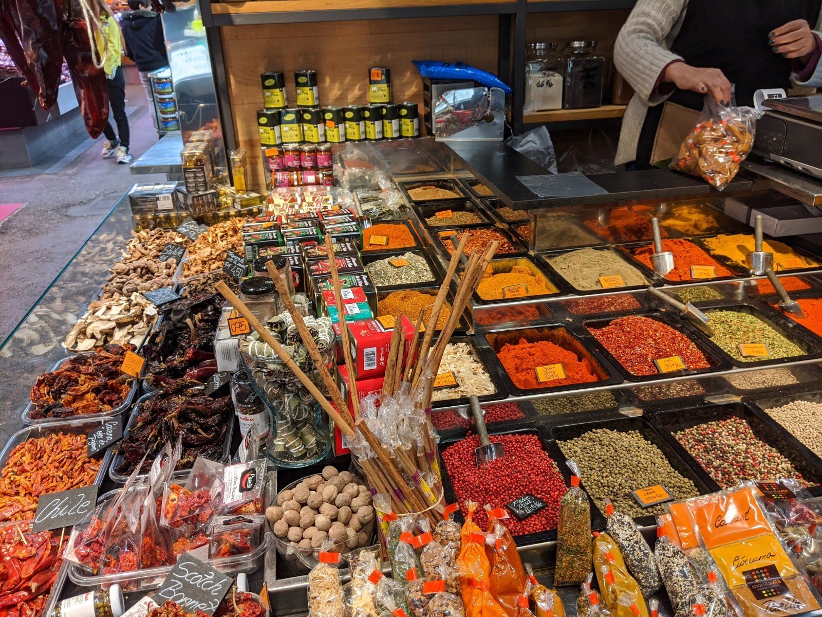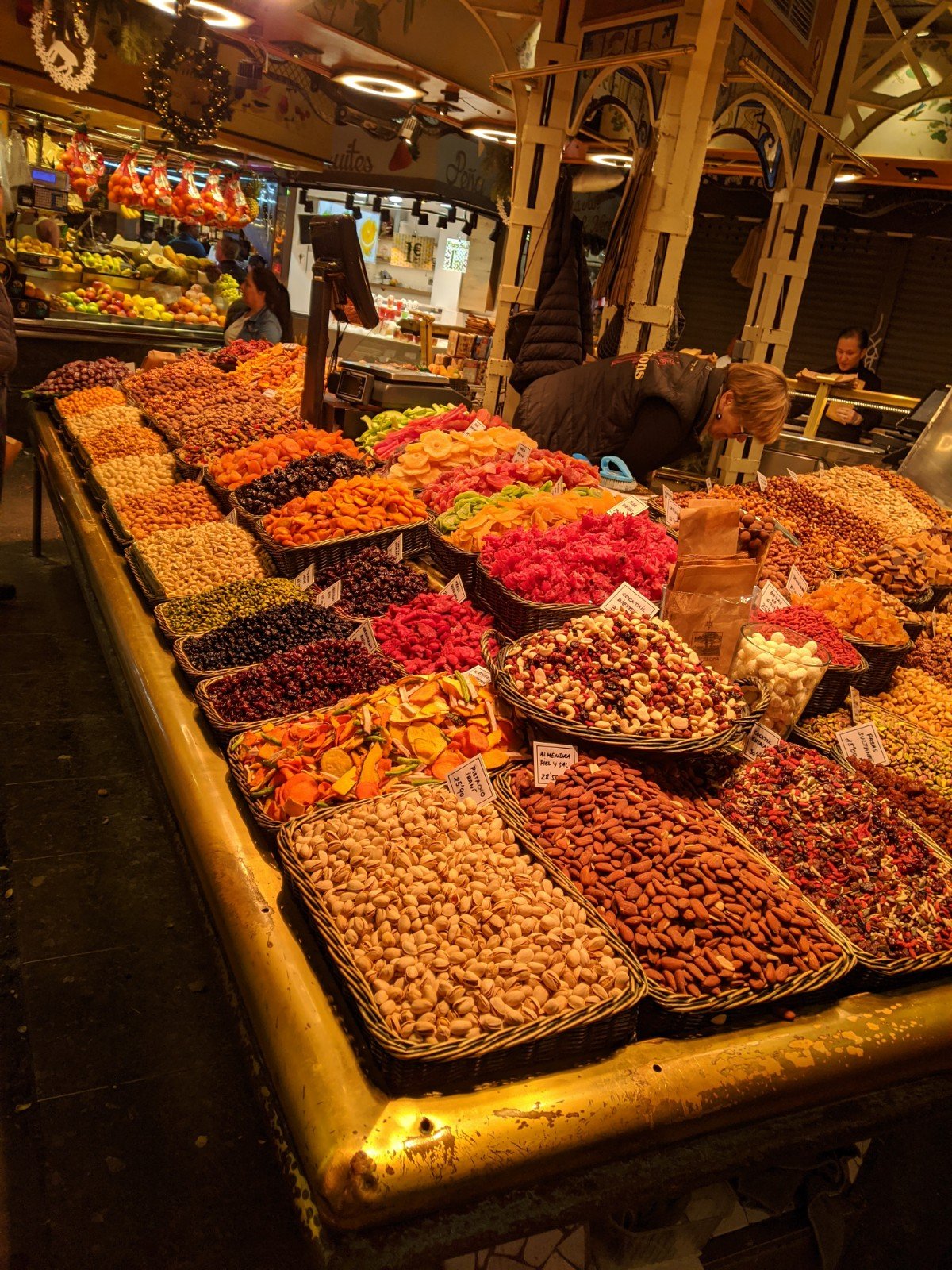 After that, we walked to a place called the Mercado de La Boqueria. The Mercado de La Boqueria is an open air market that sells most things you might need like fresh fruit juice and smoothies, meat, cheese, fruit and veggies, seafood, and spices. We tried some fruit juice and it was really good. There are so many different flavours to choose from and they are only €1.