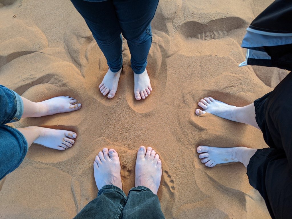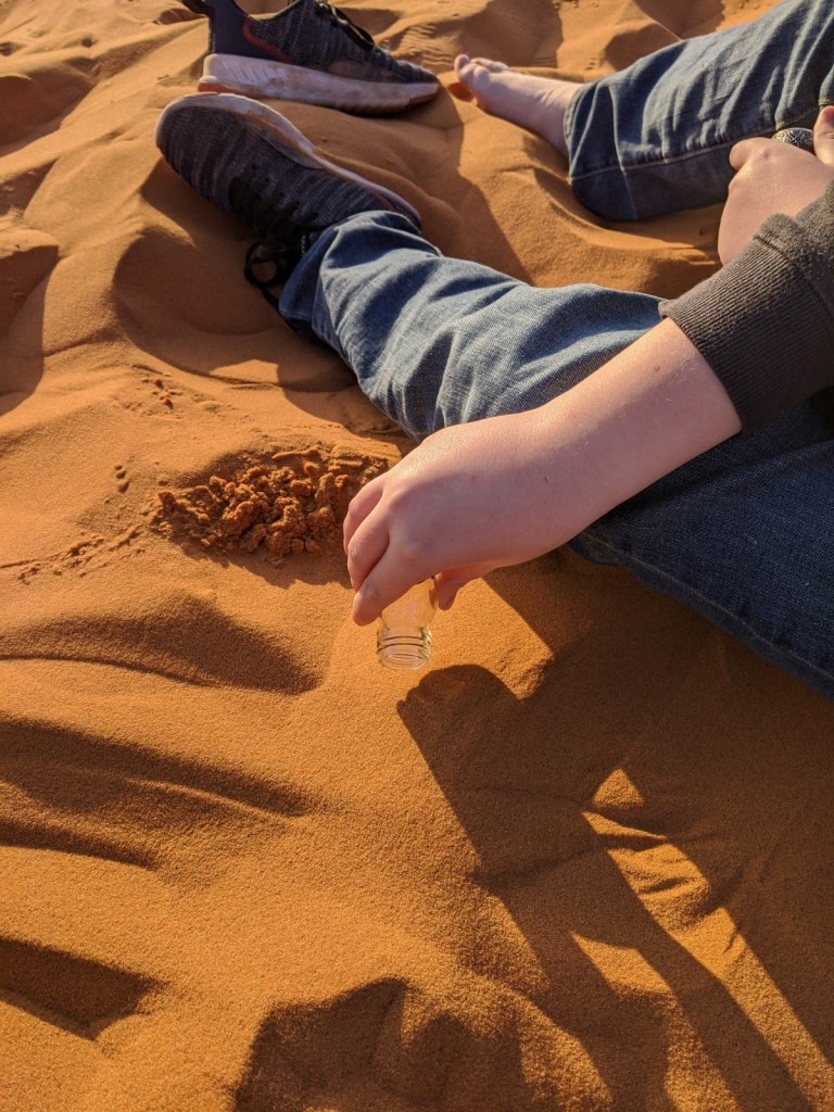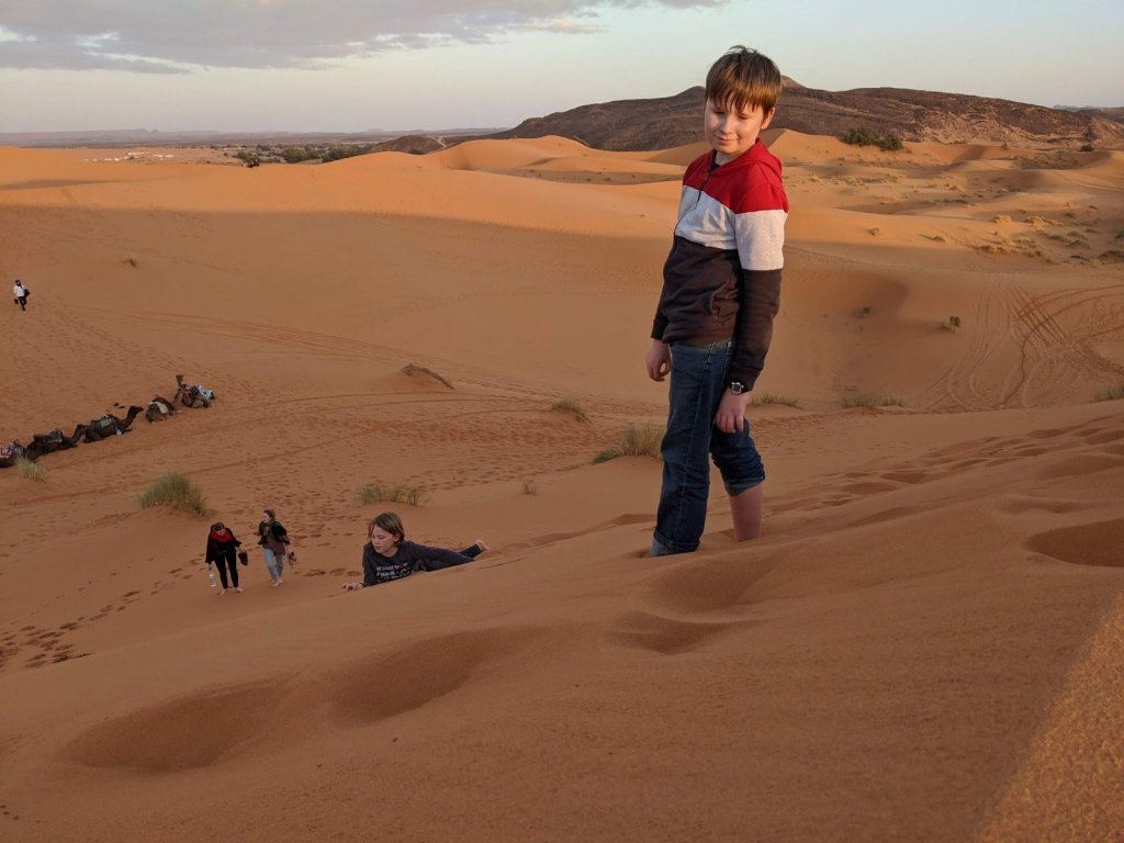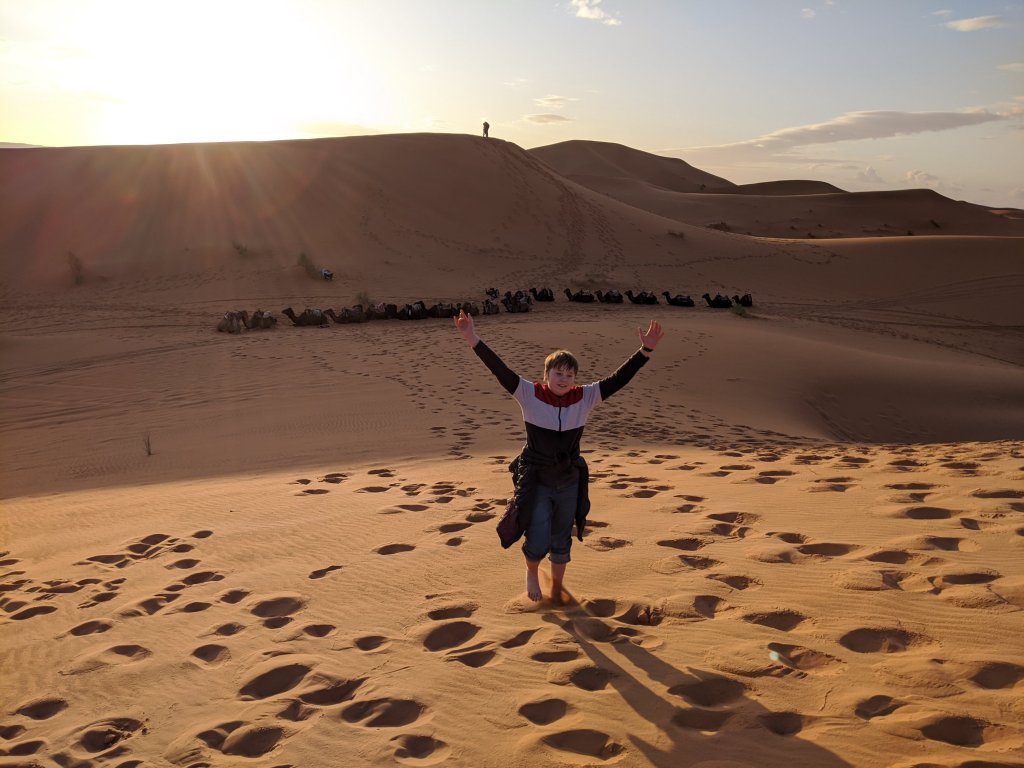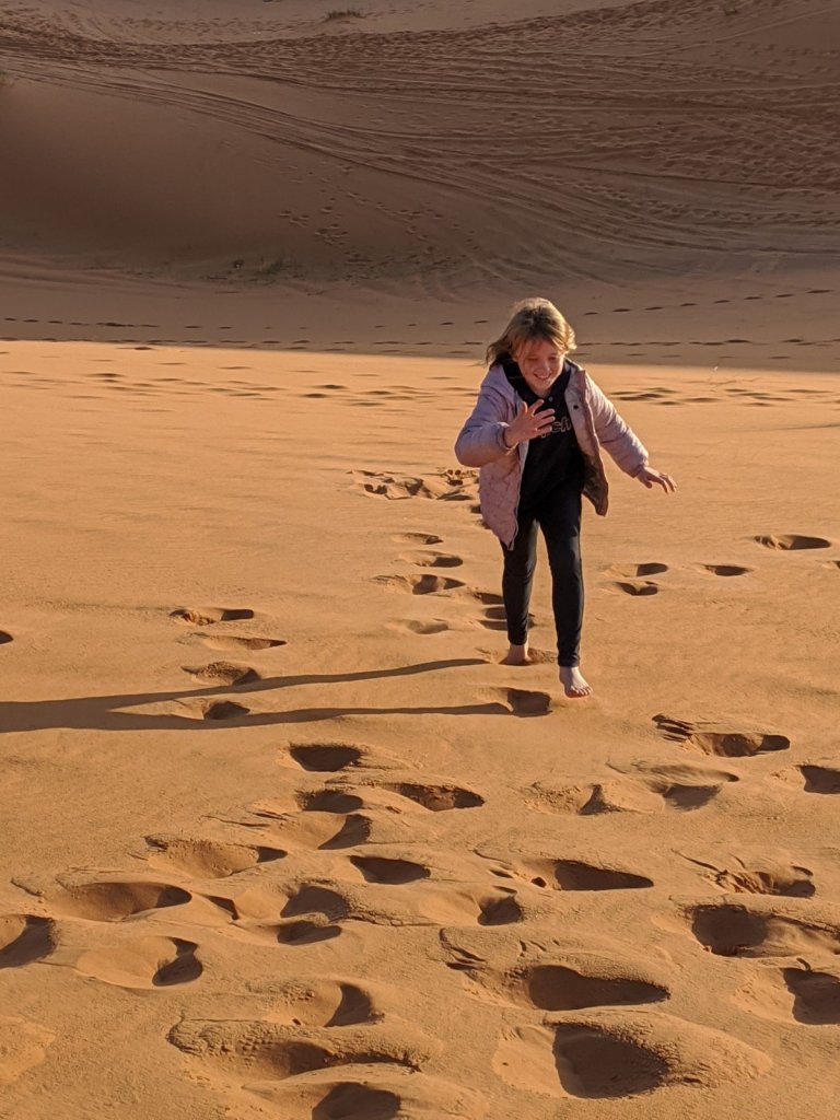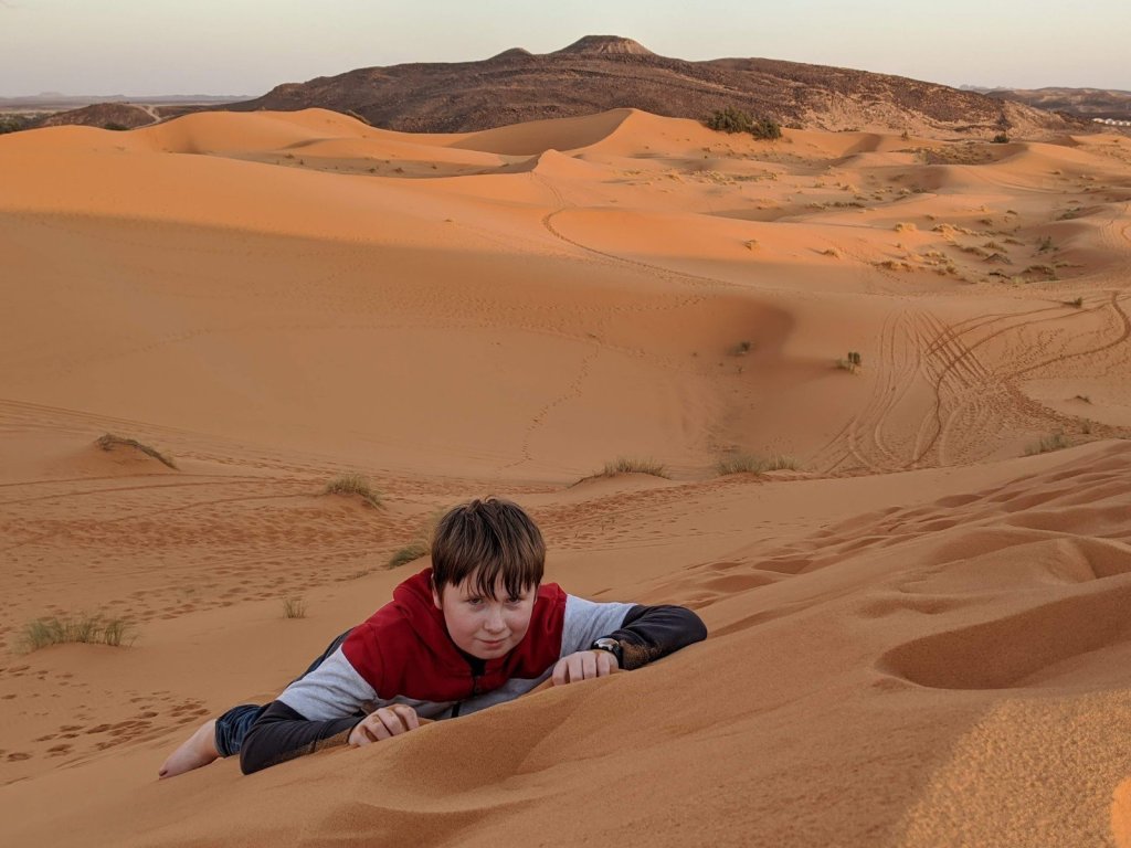 We stood up there, looking over the Sahara. We all took our shoes off because the sand was so soft. It was nice. I like the feeling of it between my toes. I loved playing in the sand and running down it and coming back up and doing cartwheels.