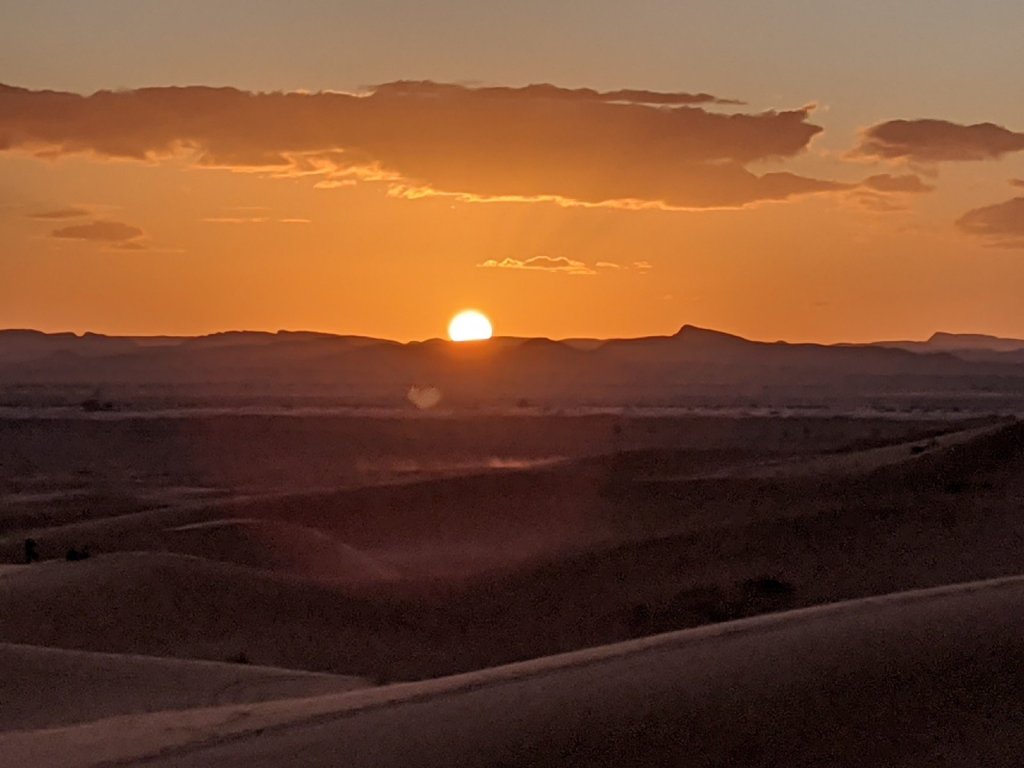 We woke up in the tent at six am because we had to get some breakfast at six thirty and mount our camels at seven. About halfway through the desert, we stopped to take a break and watch the sunrise. As soon as the sun came up, it got so much warmer!