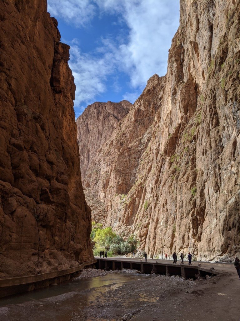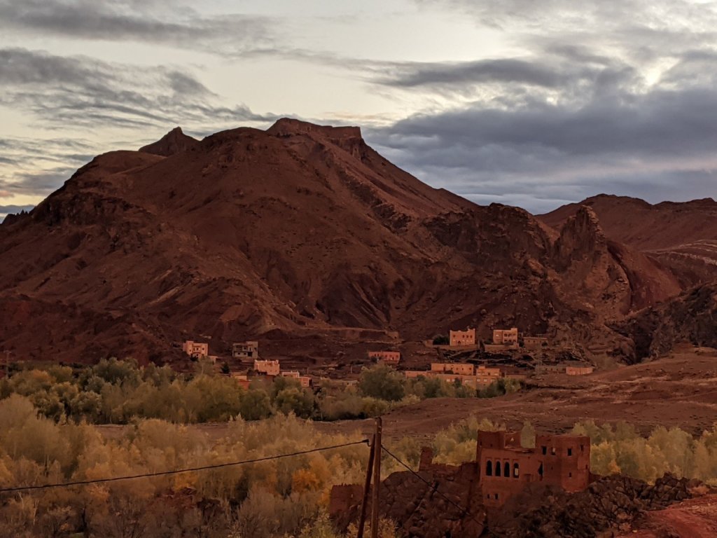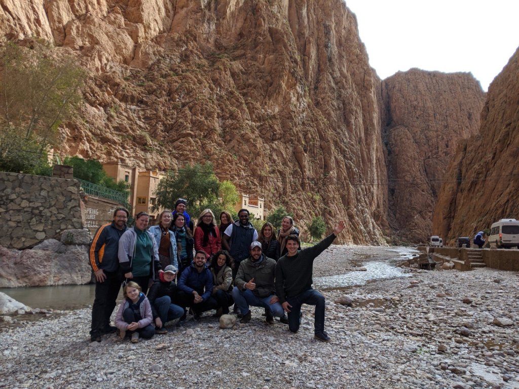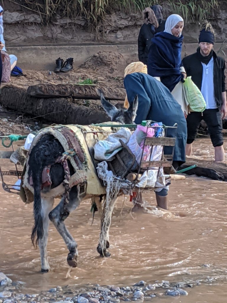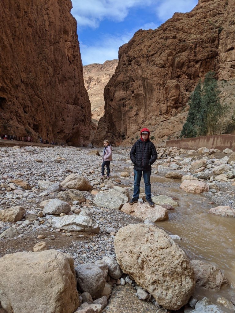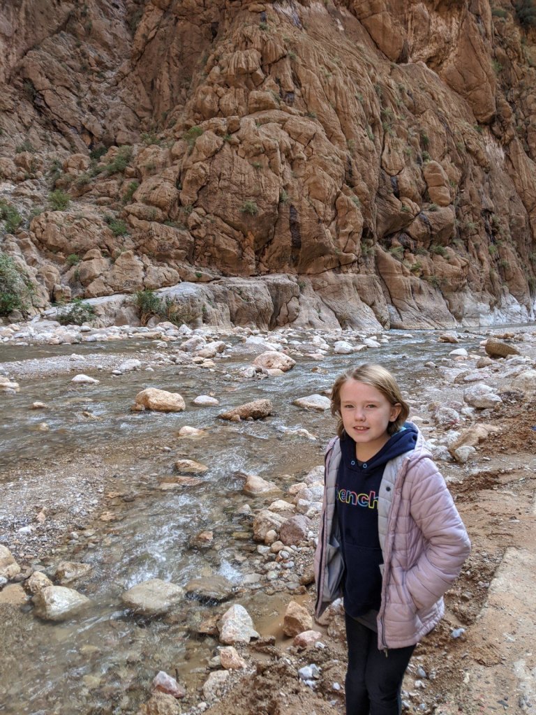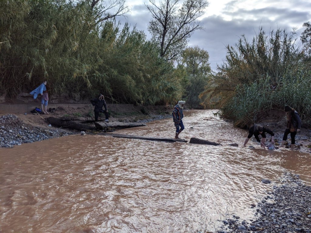 We got on the bus and as we were driving, we watched the sunrise. We hiked to see a place called Life Valley (in English) to learn about Berber nomads. To get to the next area, we had to cross a big river but it had no bridge. It didn’t have a bridge because it is usually a small river, but it rained yesterday, which it only does about once or twice a year. We had to build a bridge across it with some tree trunks placed nearby.