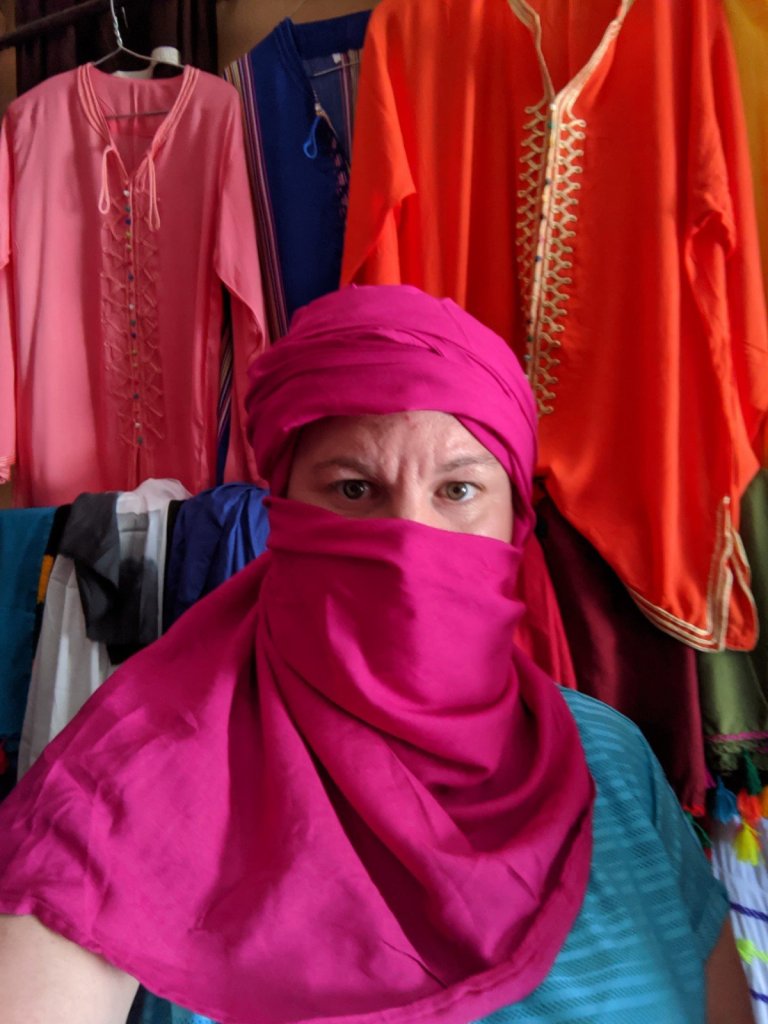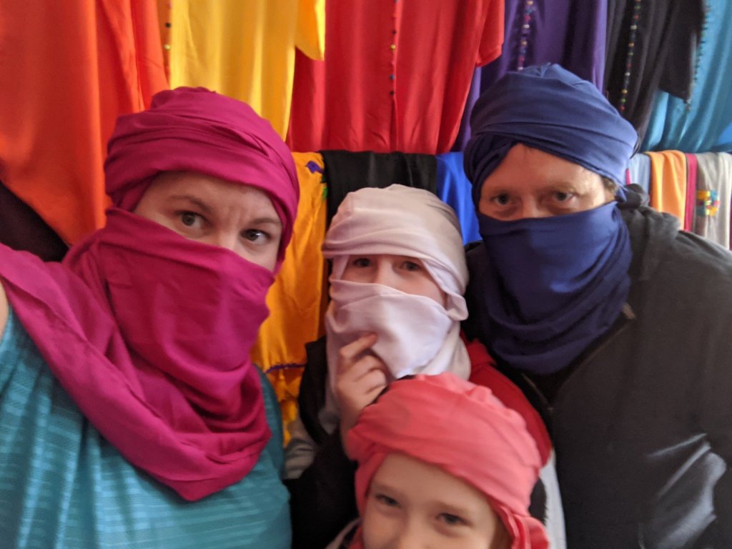 About halfway there, we stopped by a souvenir shop for scarves in the desert. You are supposed to put them around your face in a special way to protect from sandstorms so you wouldn’t get cut by the sand and to block the desert sun. My whole family got scarves. I think nearly everyone on the tour also bought them. I also got a purse at the shop. It is really pretty. We also got a fancy jar to fill with sand in the Sahara so we could take some of the Sahara back home with us.