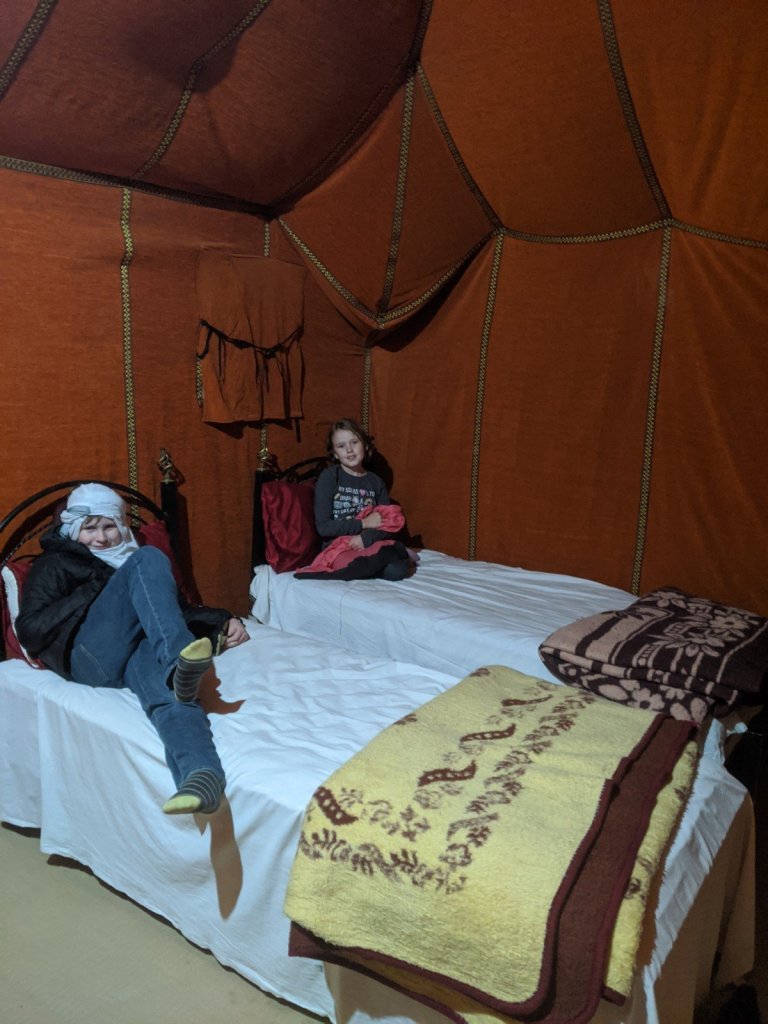 Then we got back on the camels and rode to the camp. We were in tent number 4. I was pretty happy about that because 4 is my lucky number. The tent just had one bed, but then the people who ran the tent brought in two small beds for Sam and I so we wouldn’t have to share one. I was happy about that.