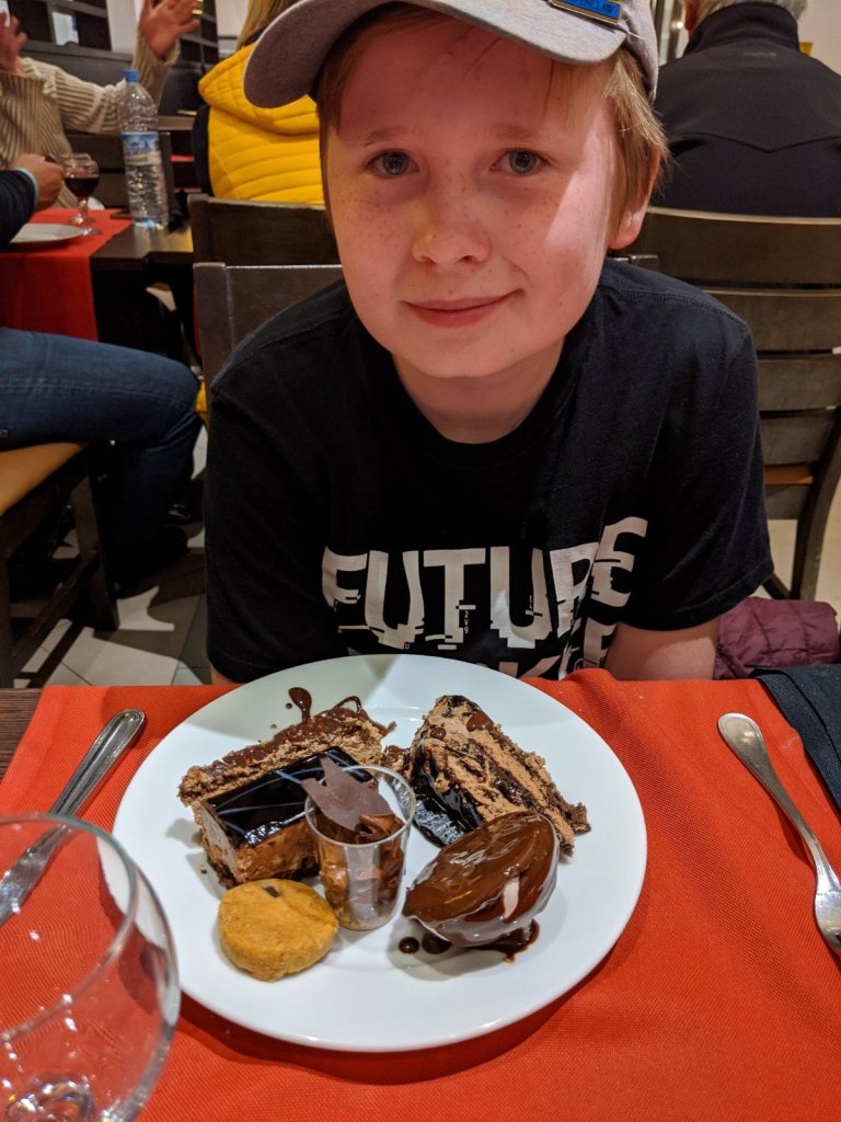 The first day, Mom, Sam and I went for lunch together. After some pasta and other food, we got a little plate of desserts and shared. Then, on the way out, we got some ice cream cones for us and Dad for a surprise.