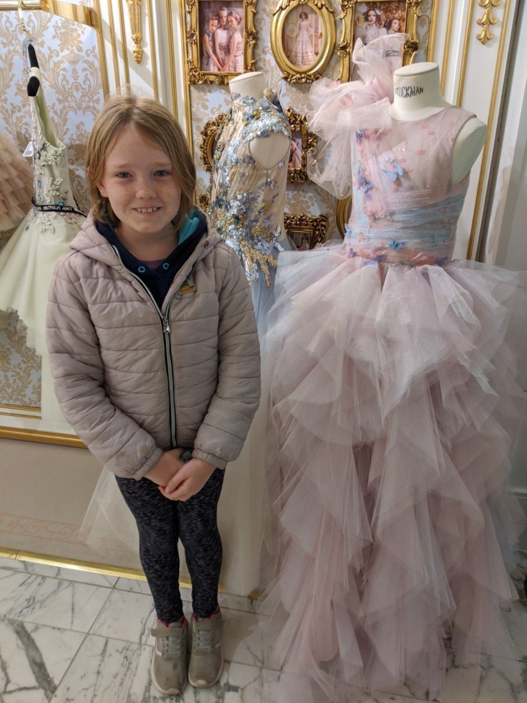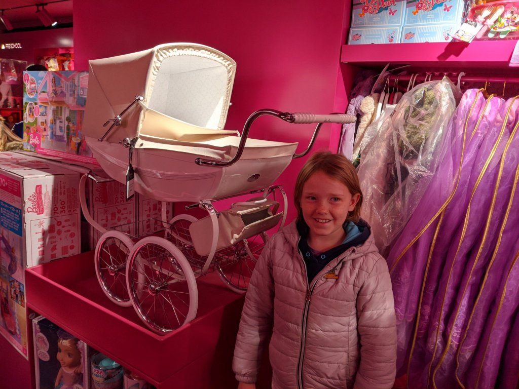 Next, we went on a bus to Harrods (a big department store with one whole floor for toys). We went right to the toy floor where we saw cool magic trick sets. I wanted them so much! We also saw dolls, Lego, stuffies, and even mini cars for kids. There was a clothing section with very fancy dresses for kids – one was £2000 ($3500)!