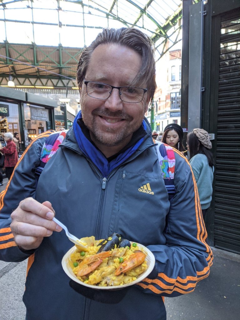 We took the train to London Bridge rail station and walked to the Borough Market for lunch. We spent about an hour walking around the market looking at all the foods, desserts, cheeses, spices, and decided on some potato latkes (a type of Israeli food) and they were pretty good. Dad got some Spanish paella.