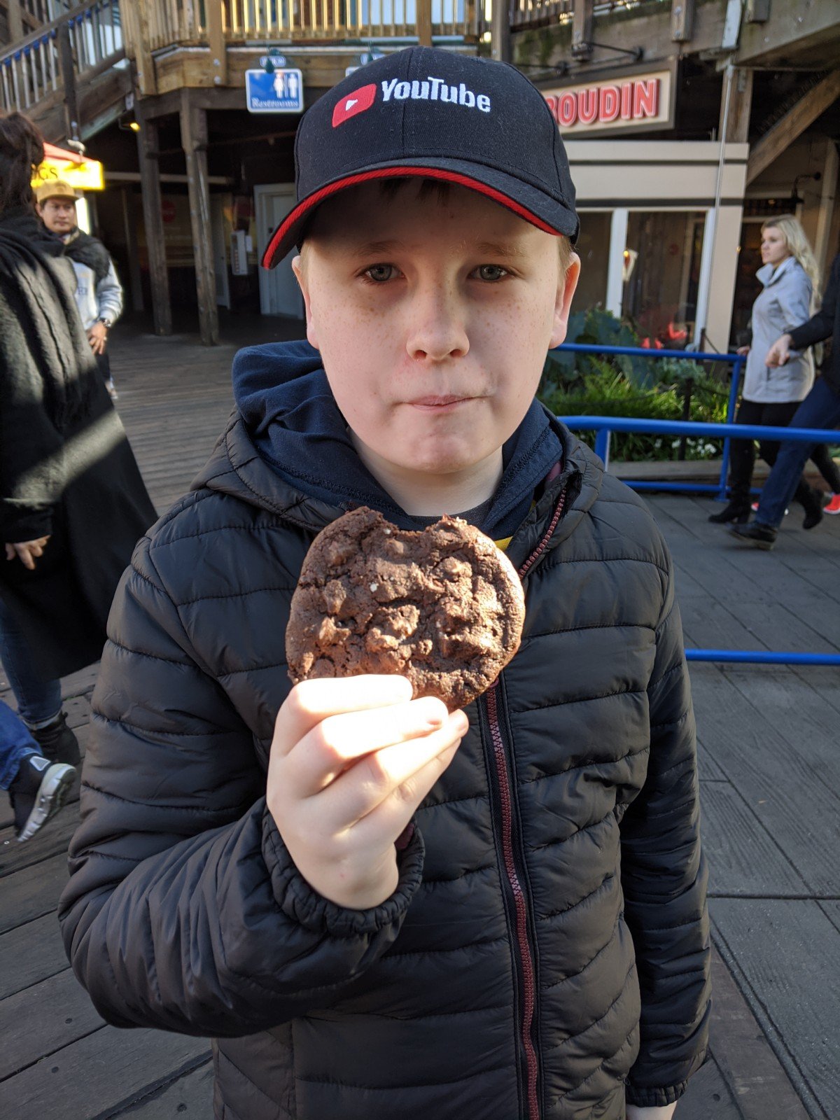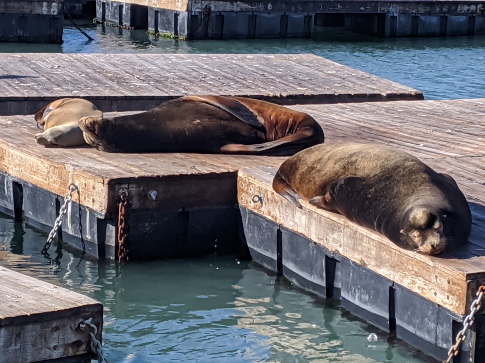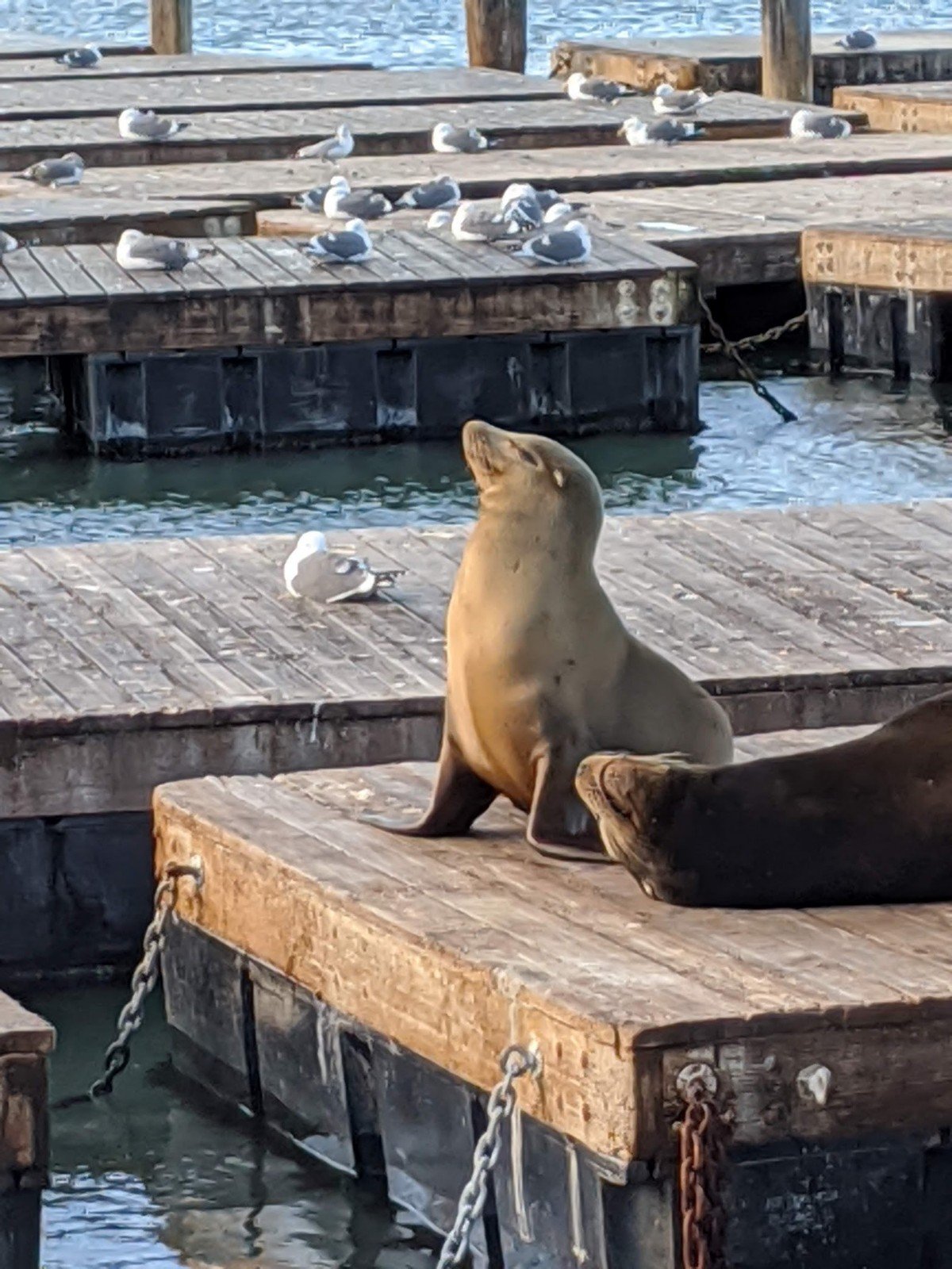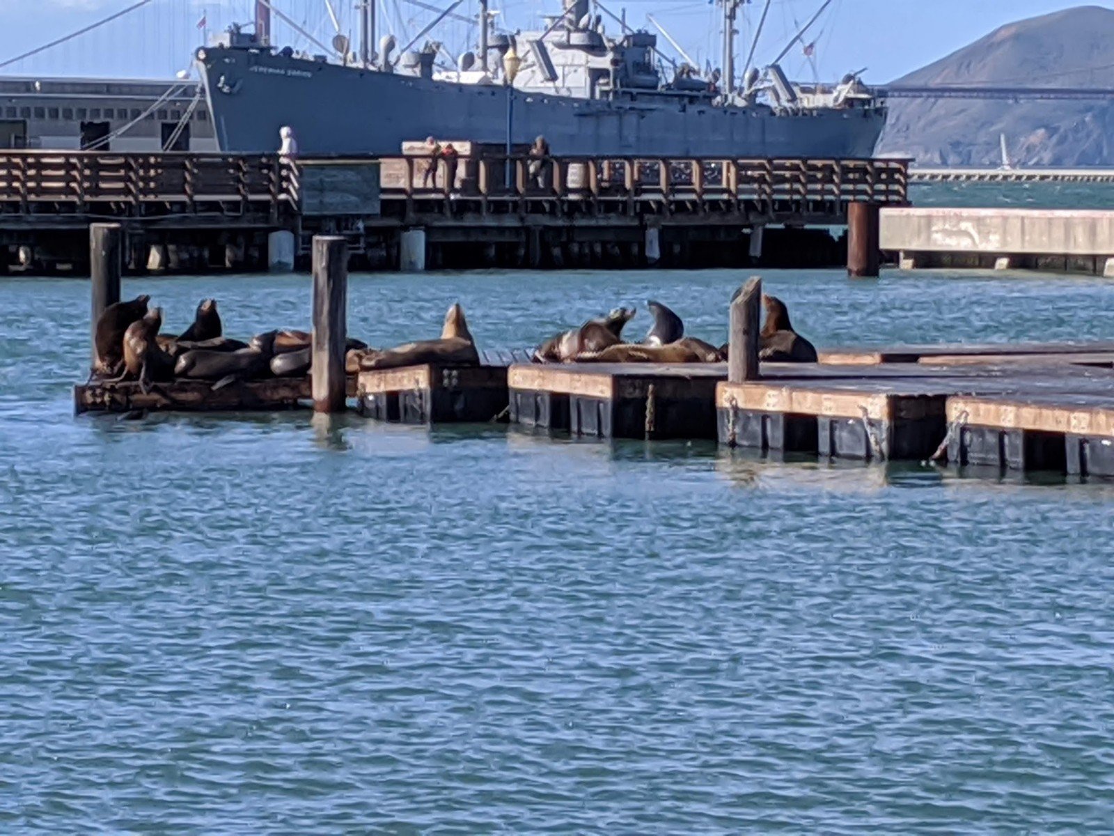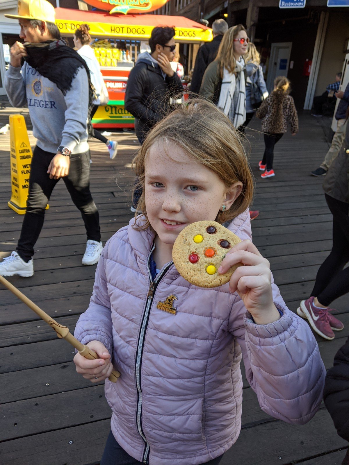 We walked along the wharf until we got to Pier 39. Pier 39 is a big pier with lots of sea lions that like to hang out. We watched the sea lions for a while and named them Vincent and Eddie but we realized that it was almost time for Dad’s football game. We grabbed Mrs. Field’s cookies for a snack on the way.