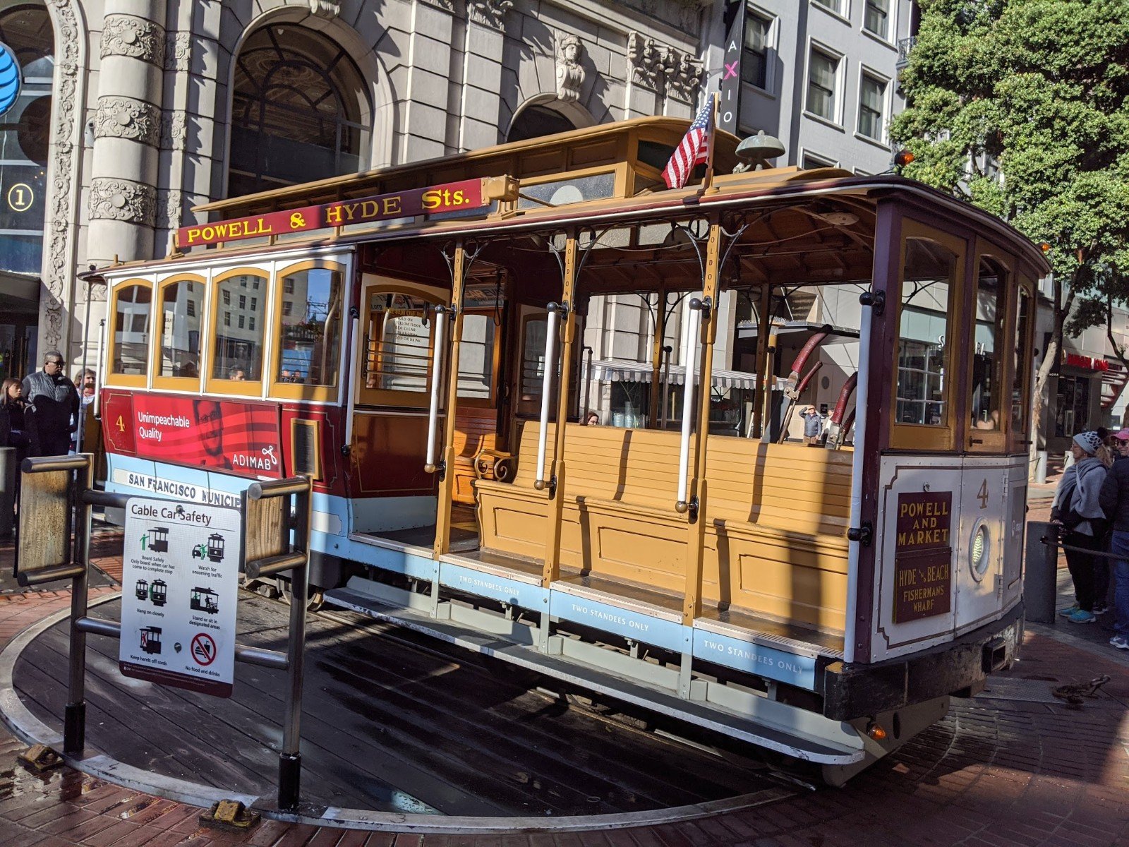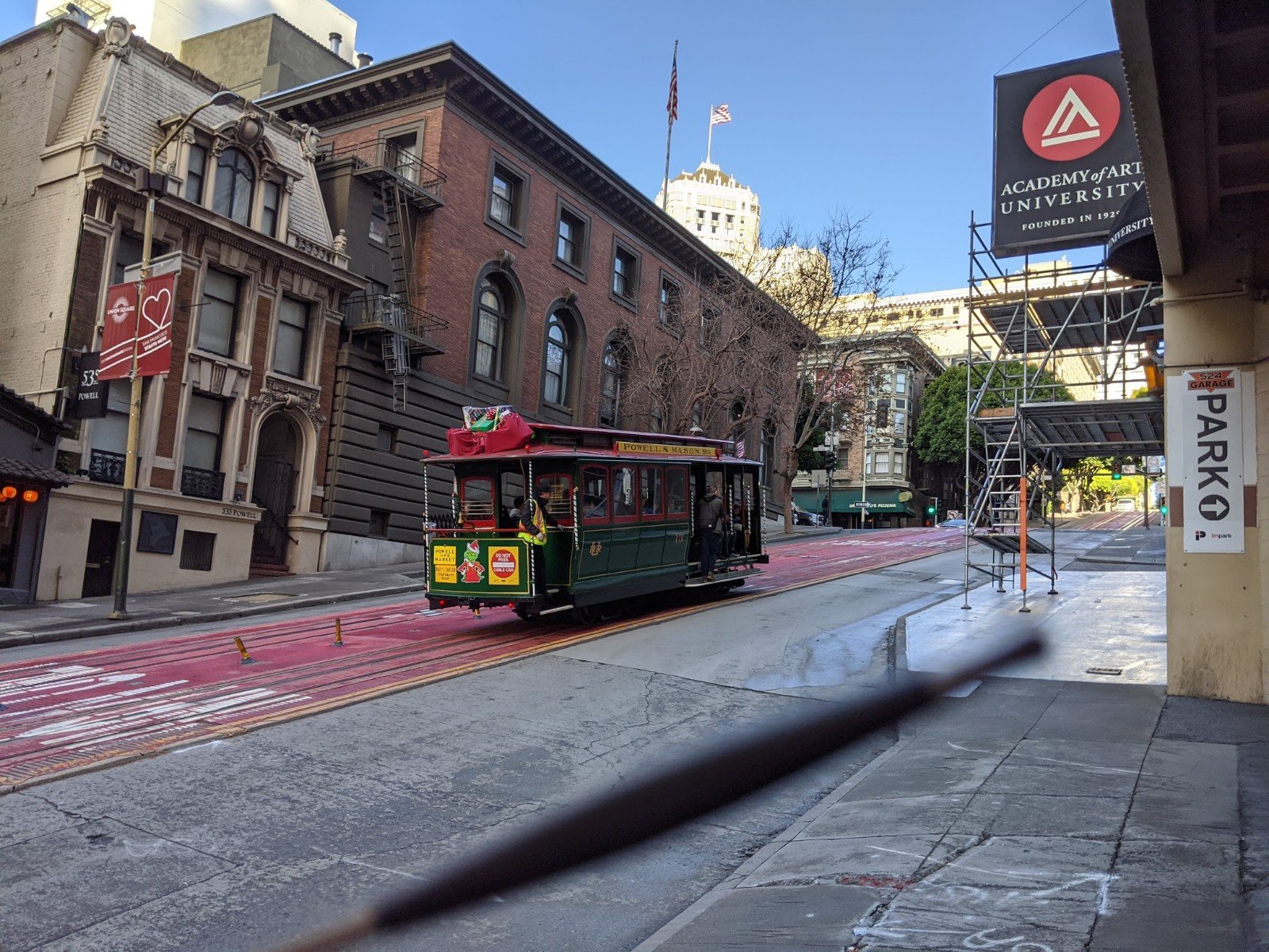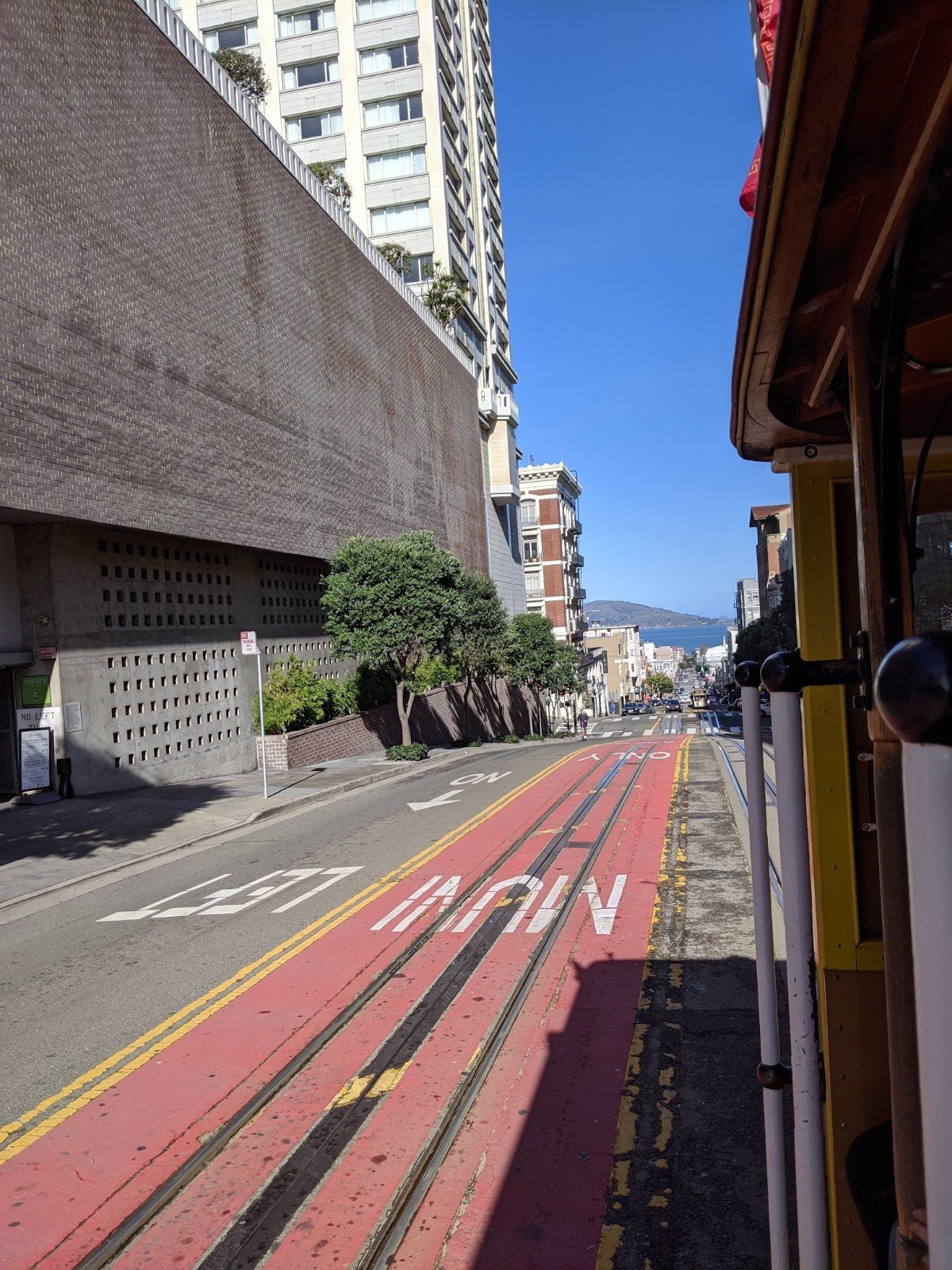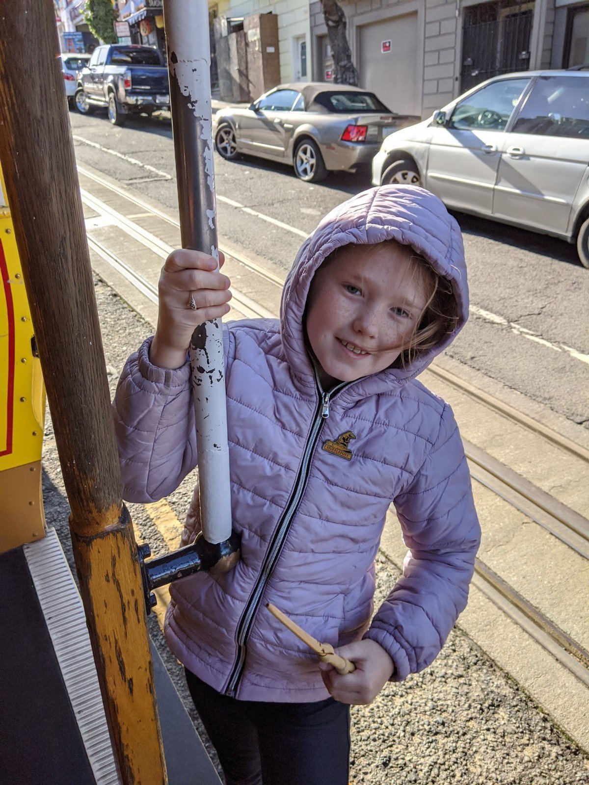 We walked down a hill to get to the trolley boarding area to go to Fisherman’s Wharf. About halfway to the wharf, the trolley stopped because downtown something was wrong (it turned out the cable was fraying), so the downtown trolley stopped for the day. Our trolley was just outside of the downtown area, so we kept going to the wharf.