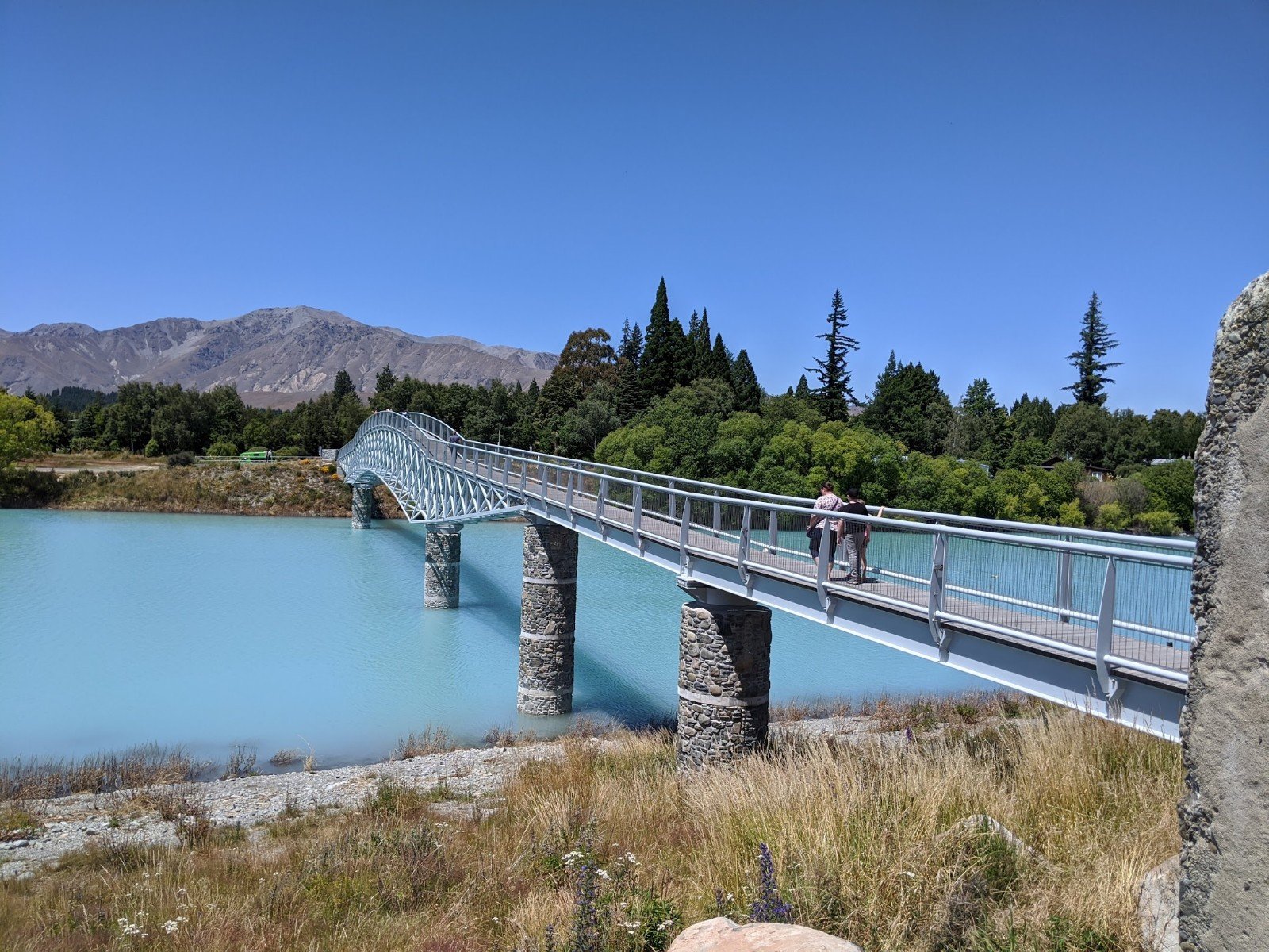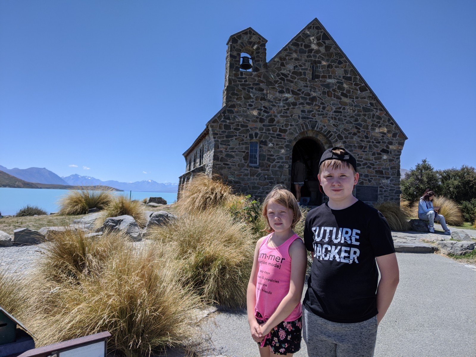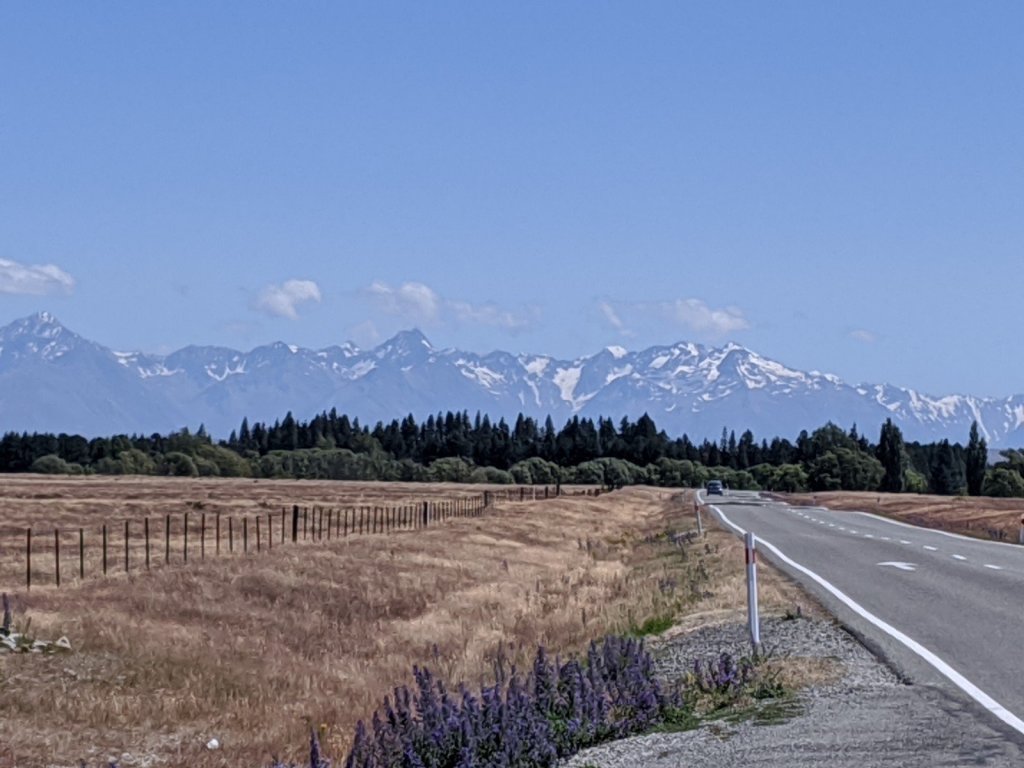 This morning we packed up quickly and got on the road to Lake Tekapo, a lake of glacier water that is turquoise. We put our feet in, and it wasn’t as cold as we thought it would be.