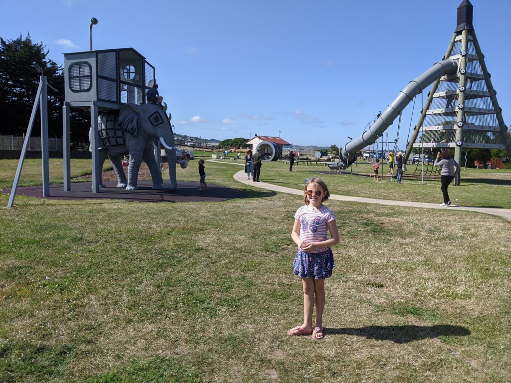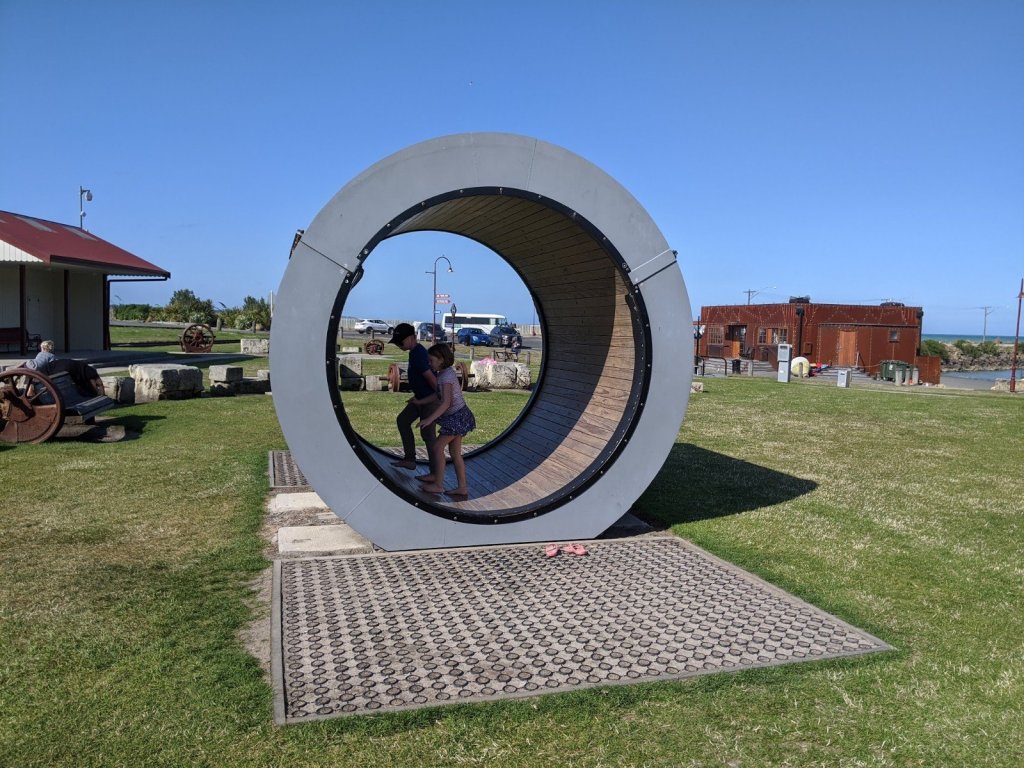 Then we got to the camping park. It was the first one we paid for, but it was right by the coast and has baby penguins nesting under the kitchen deck. Right beside the campsite, the was a huge playground. Sam and I loved the hamster wheel. It was so fun to run in it! Dad and Mom checked out a brewery next to the park while we played.