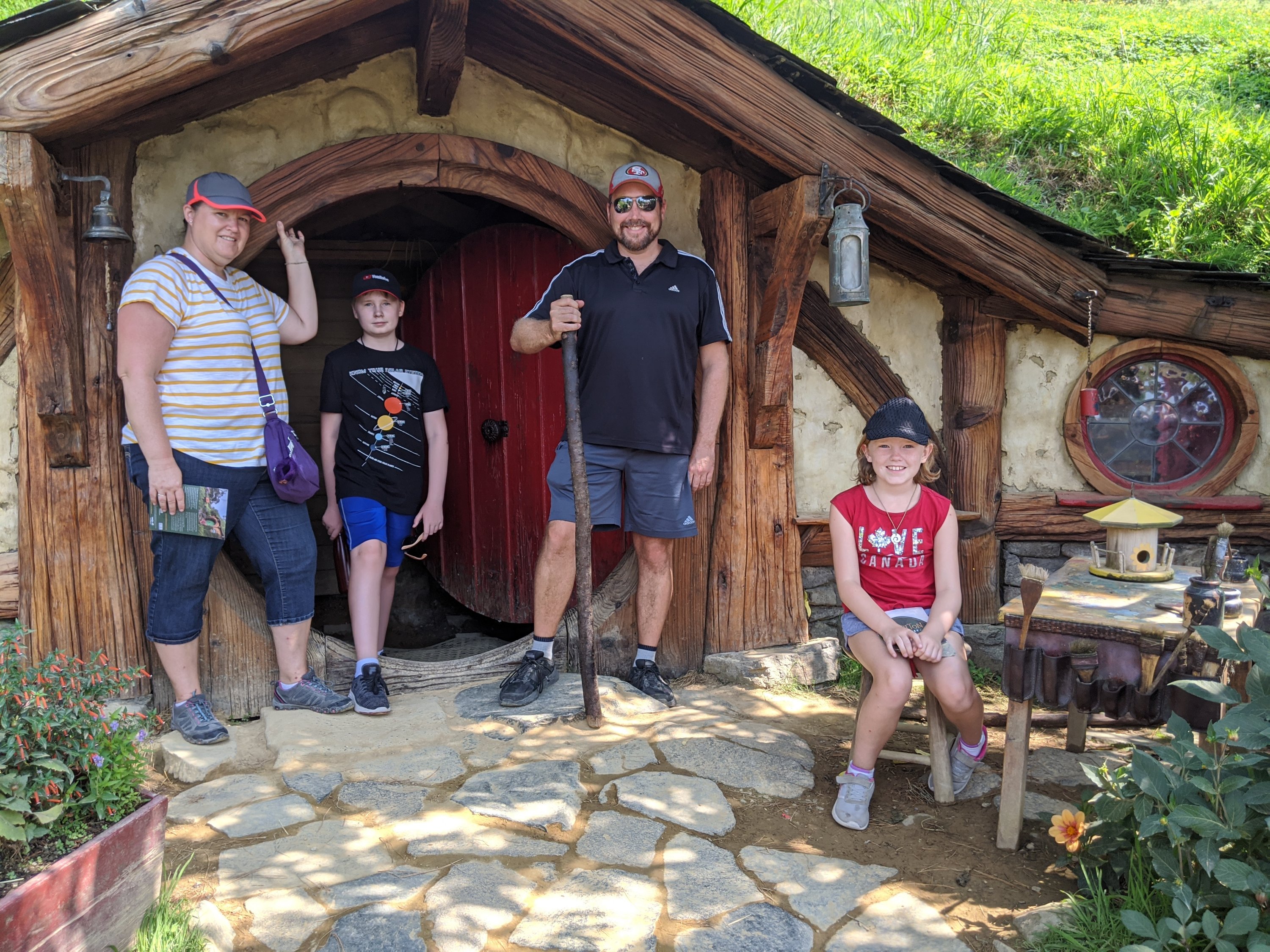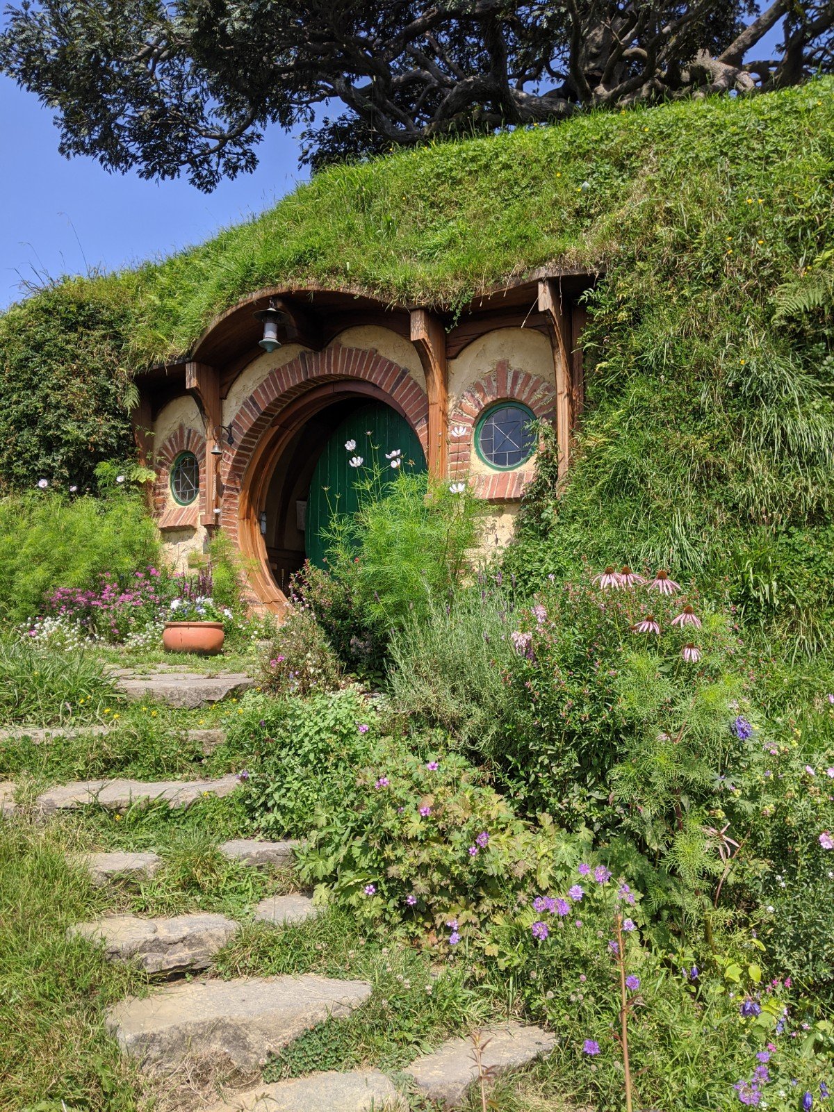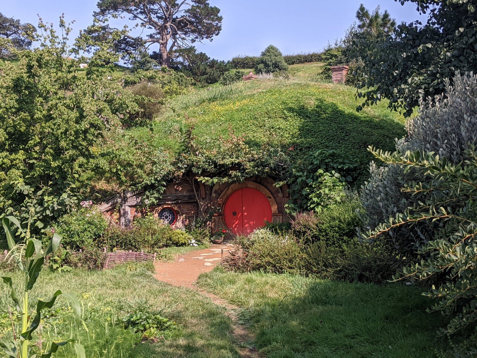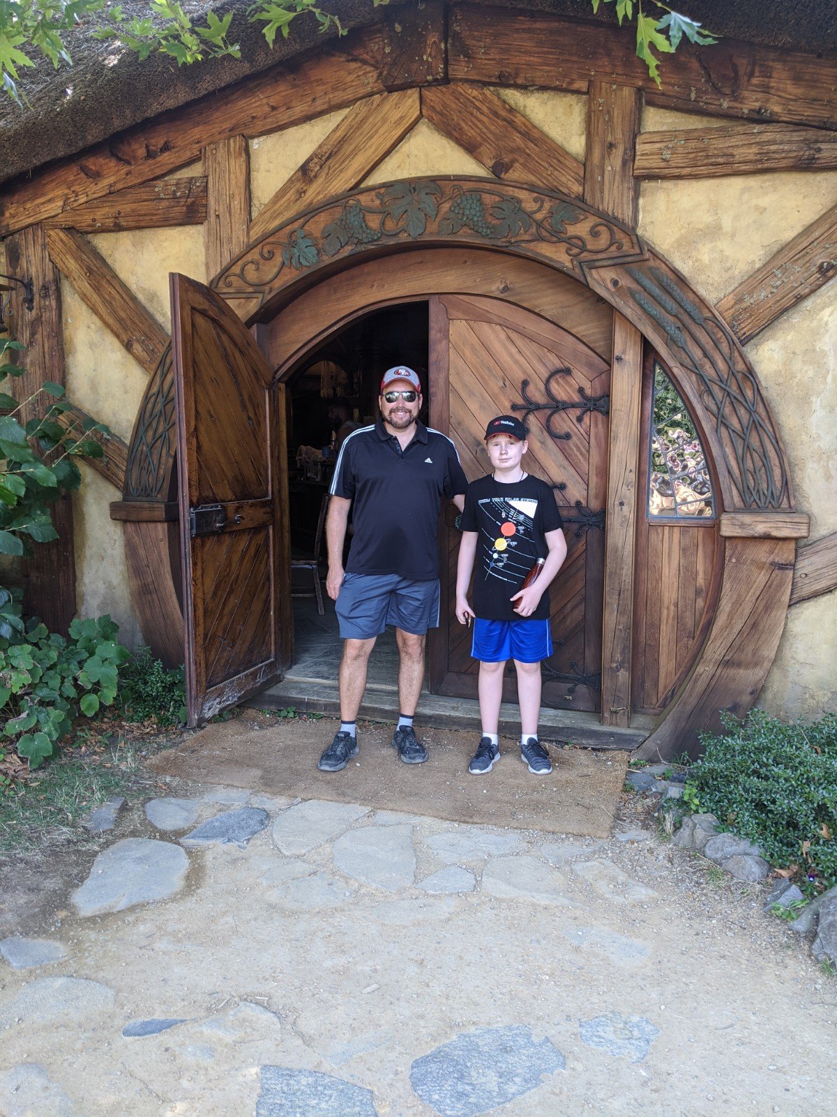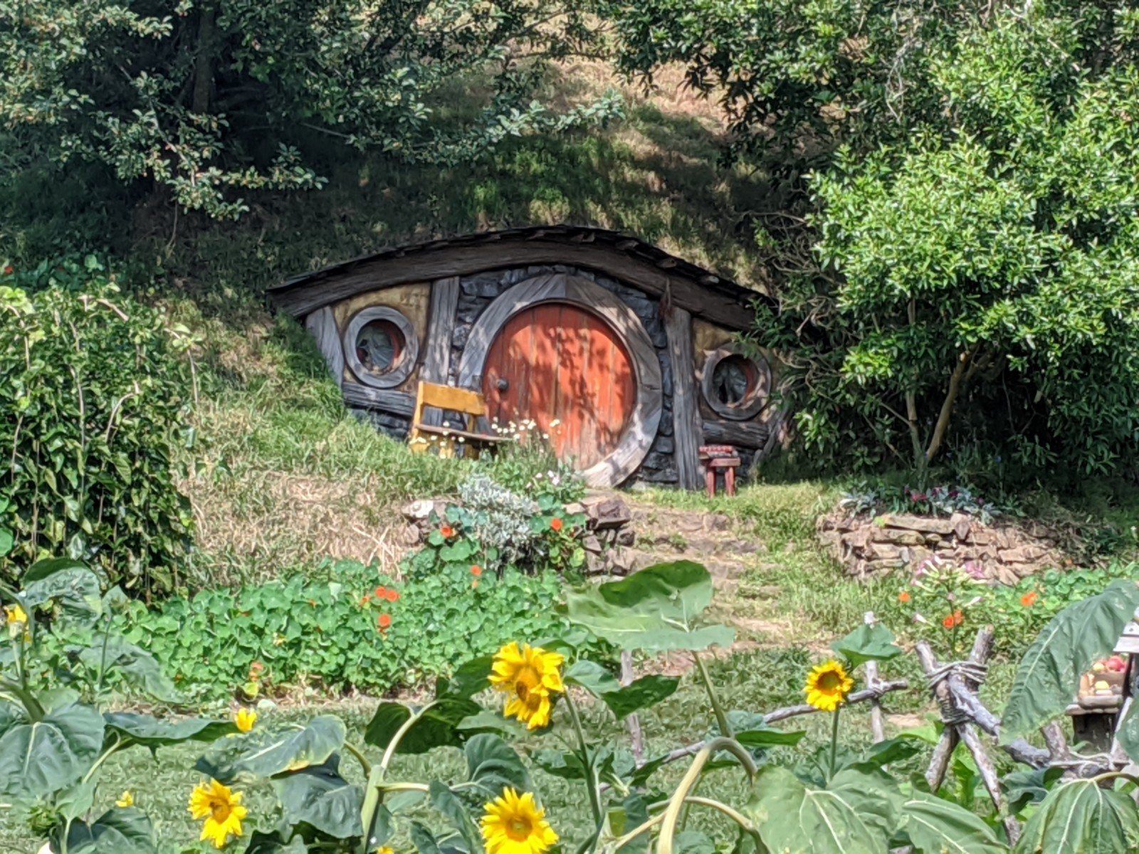 We saw the main Hobbit hole there where Bilbo lived. It was the biggest Hobbit hole there. It had a big circle green door that had a gold doorknob in the middle.