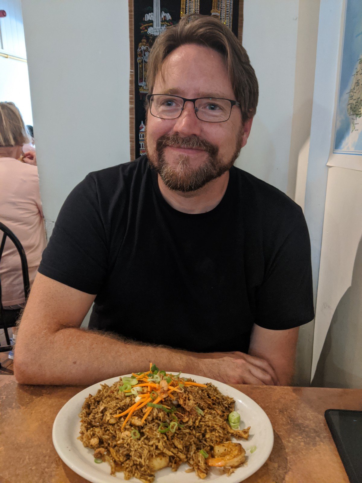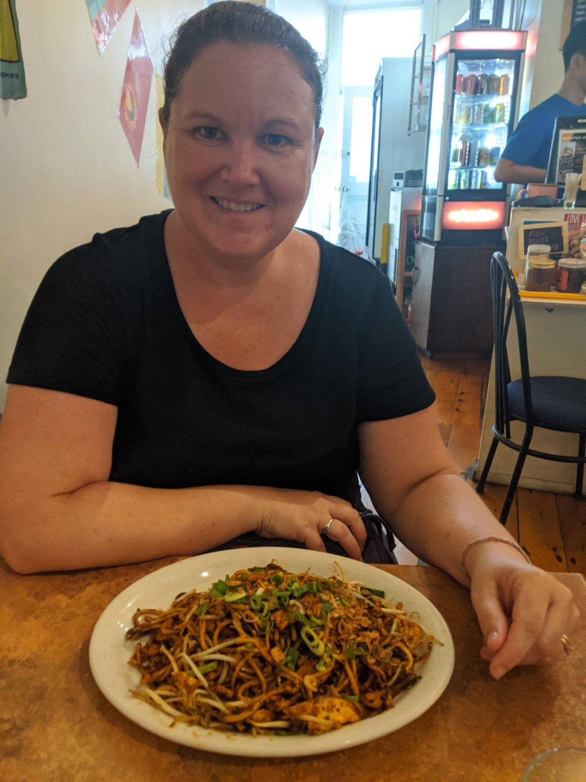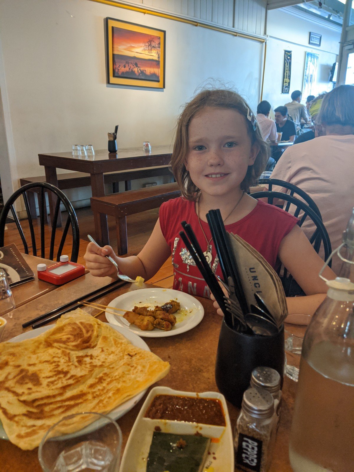 When we got hungry, we found a restaurant called Uncle Man’s that has a high rating on TripAdvisor. It is a Malaysian restaurant. We all really liked our food. Sam and I shared chicken satay (grilled chicken on skewers) and roti planta (grilled flatbread with butter and a curry dipping sauce). The chicken came with little rice cubes that were delicious! Dad ordered Nasi Goreng with chicken, prawns, and fish. Nasi means rice. Mom chose Mee Goreng with chicken. Mee means egg noodles. Goreng is the spices or special sauce, I think.