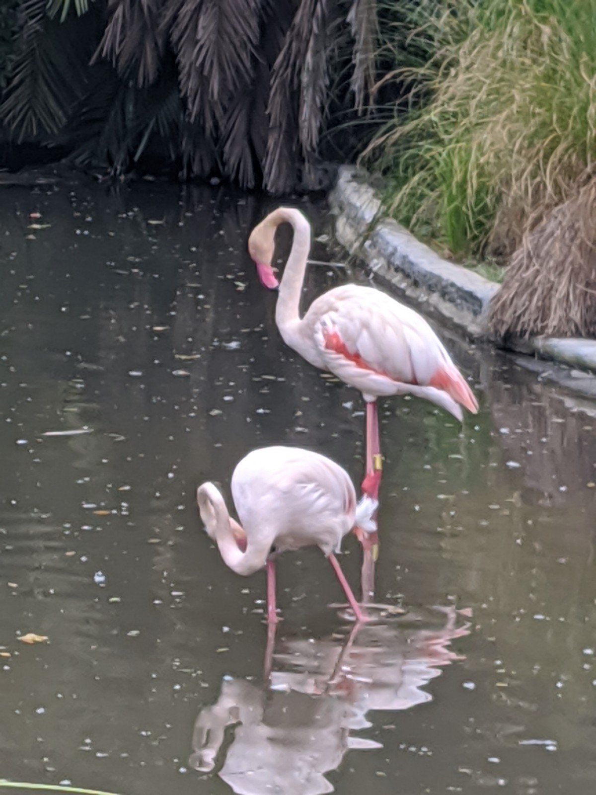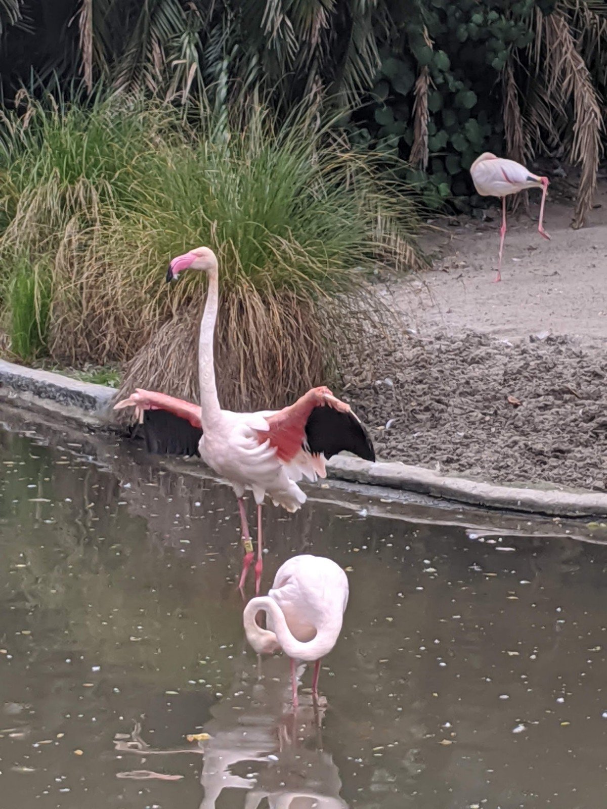 The flamingos were beautiful. There were lots of them. There was a funny one that had his leg wrapped up all wrong.